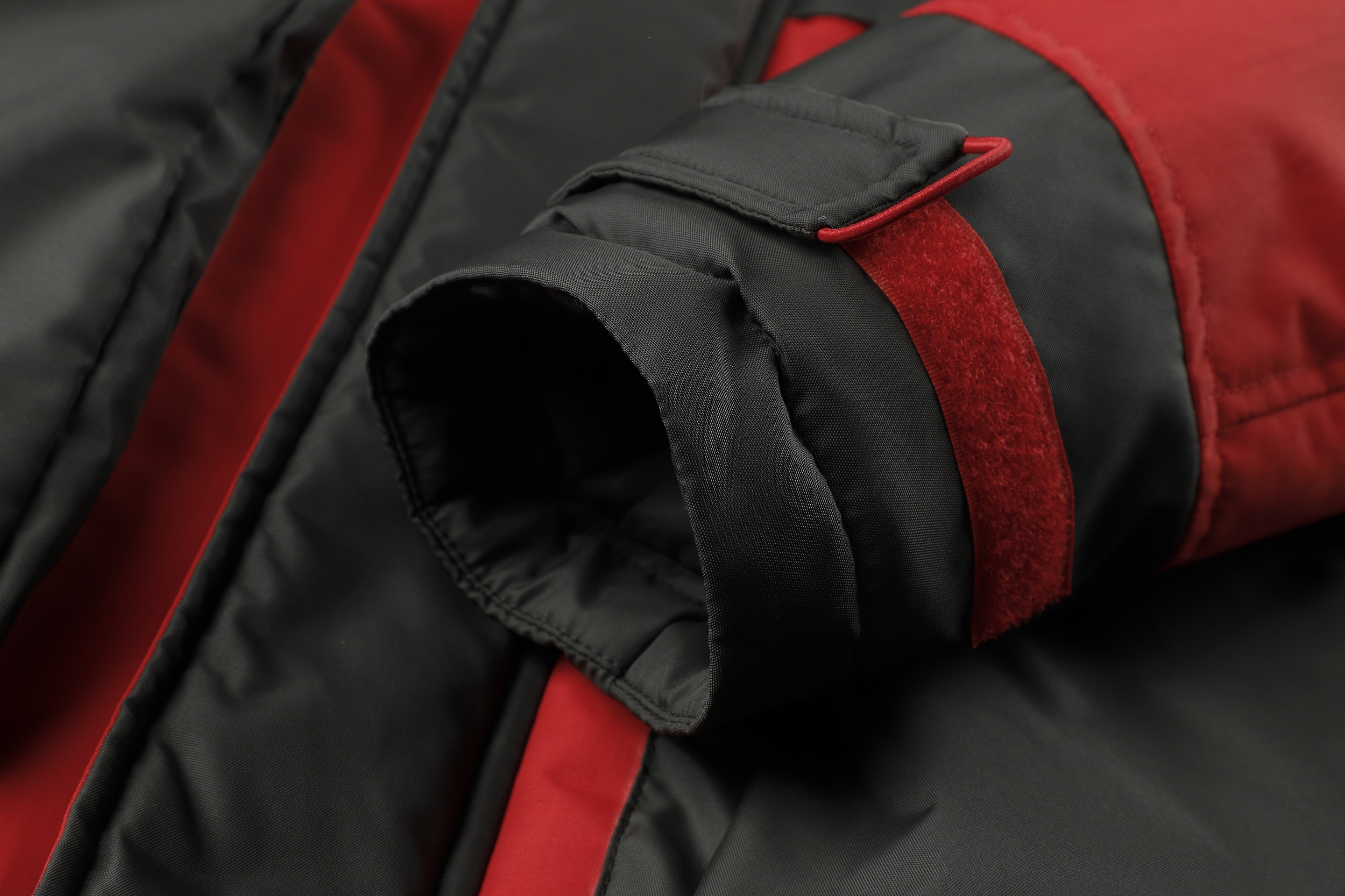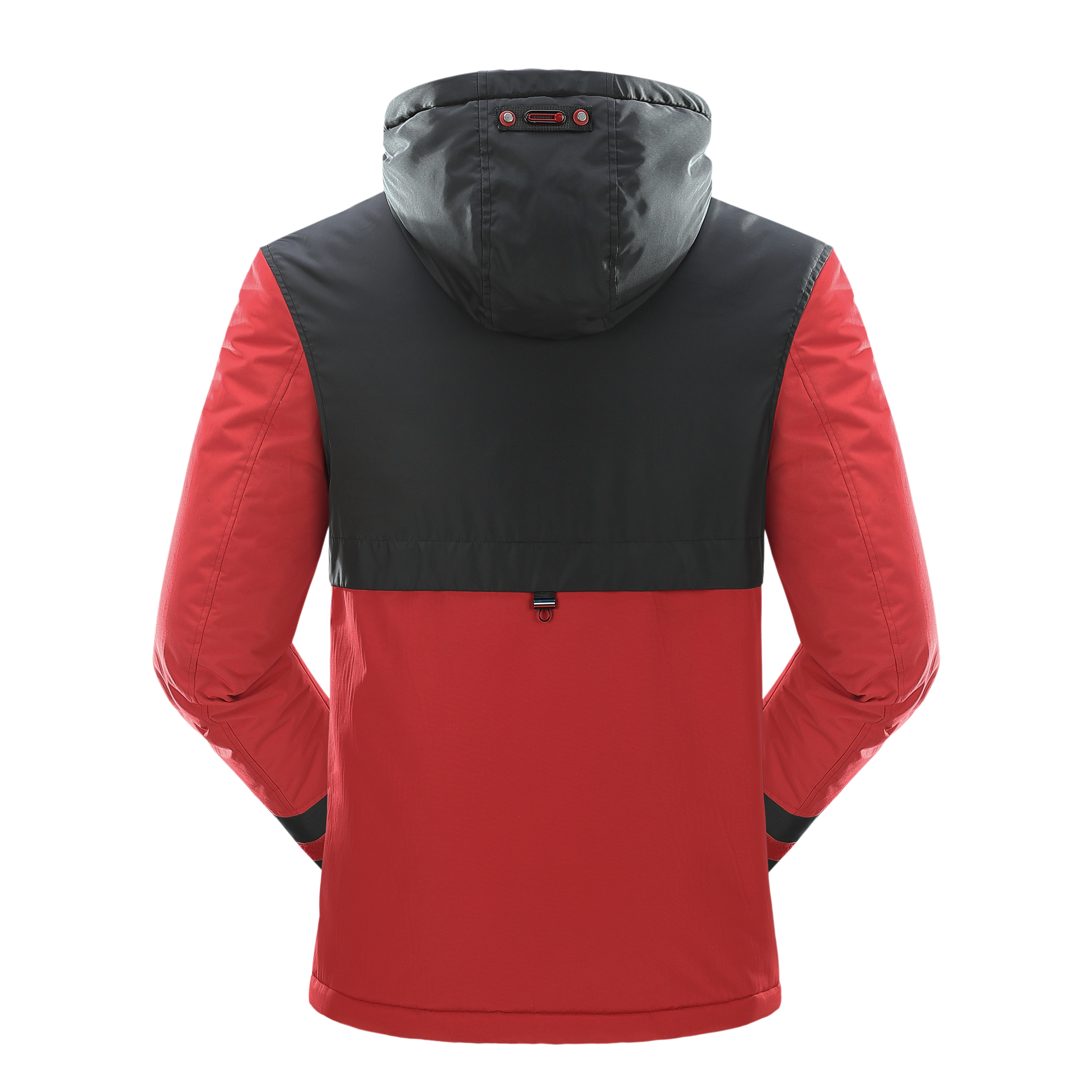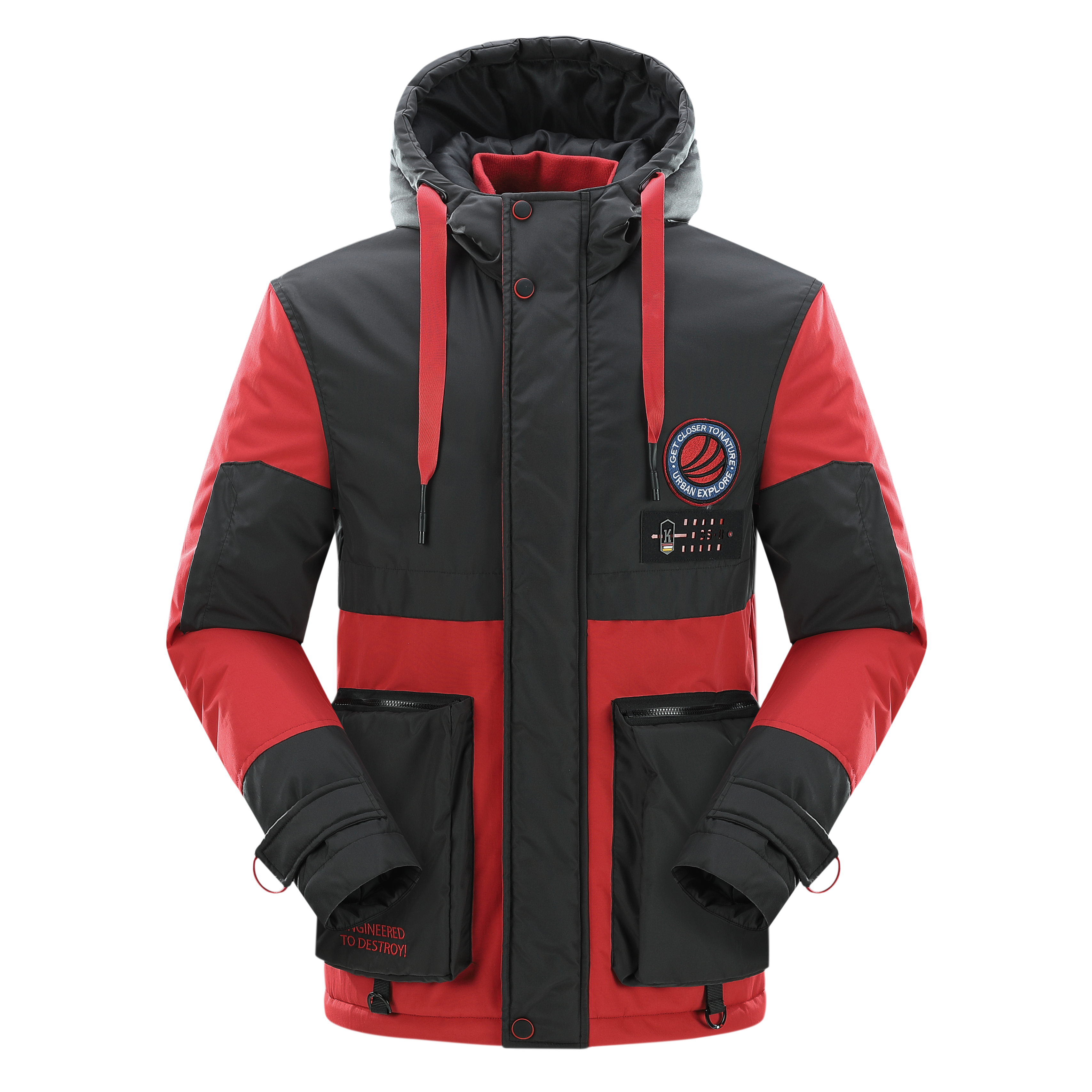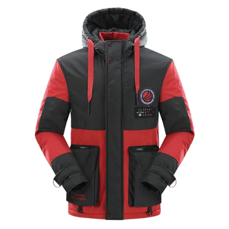 .The jacket features a hood with a fur-like trim and a front zipper. It has a color-block design with red as the primary color and black accents. The jacket includes multiple pockets, with two large black pockets on the front and additional zippered pockets. The cuffs appear to be adjustable, and there's a logo patch on the left chest area. The platform provides a 360-degree view option, allowing customers to examine the jacket from all angles. This jacket seems designed for cold weather, offering both warmth and style. It's suitable for outdoor activities or casual wear.