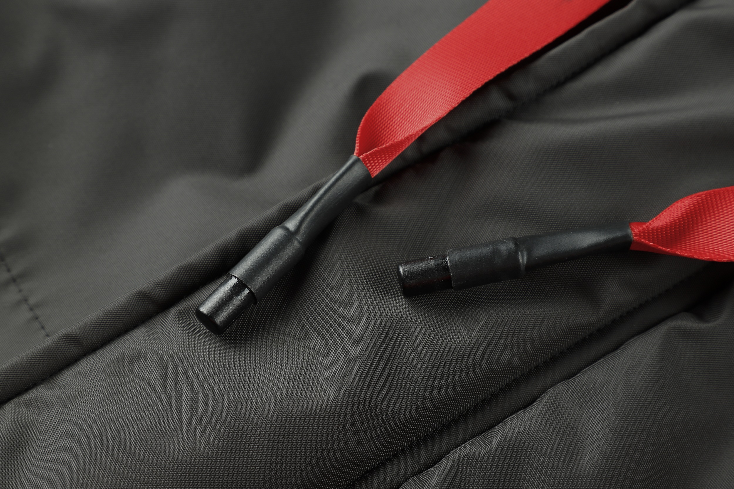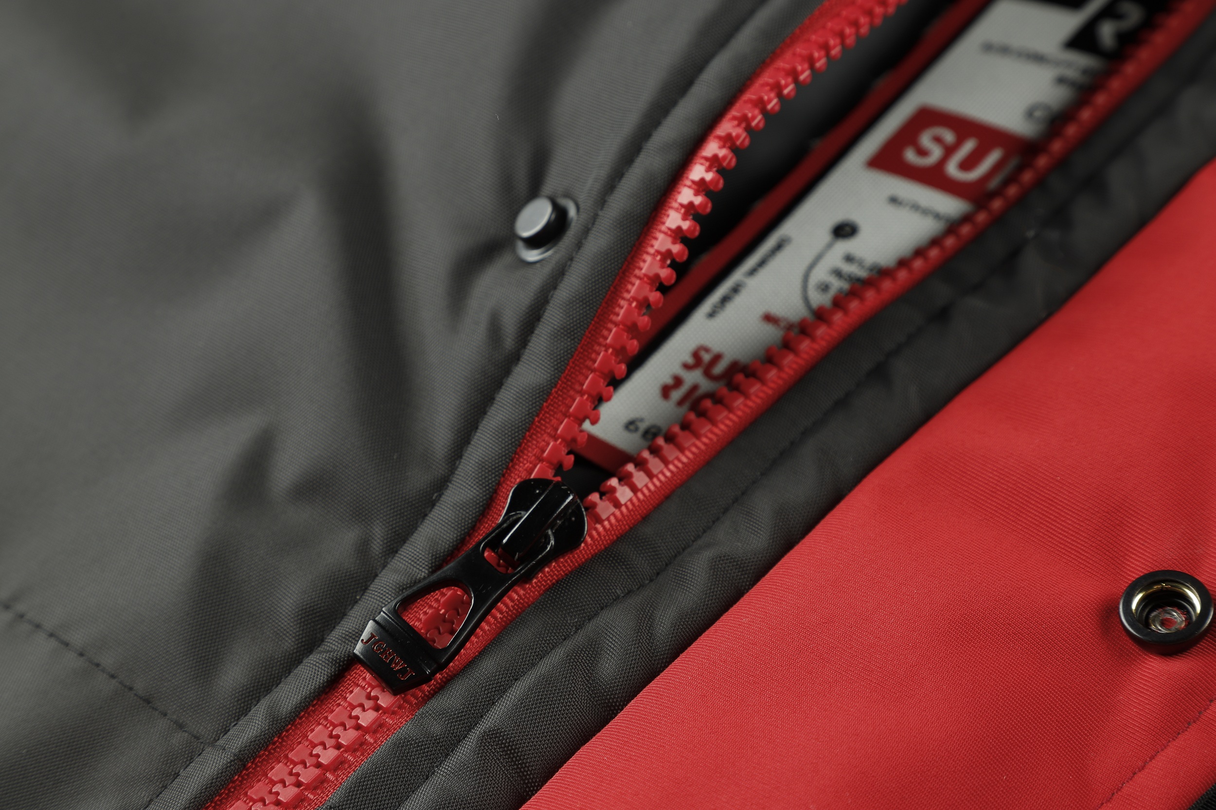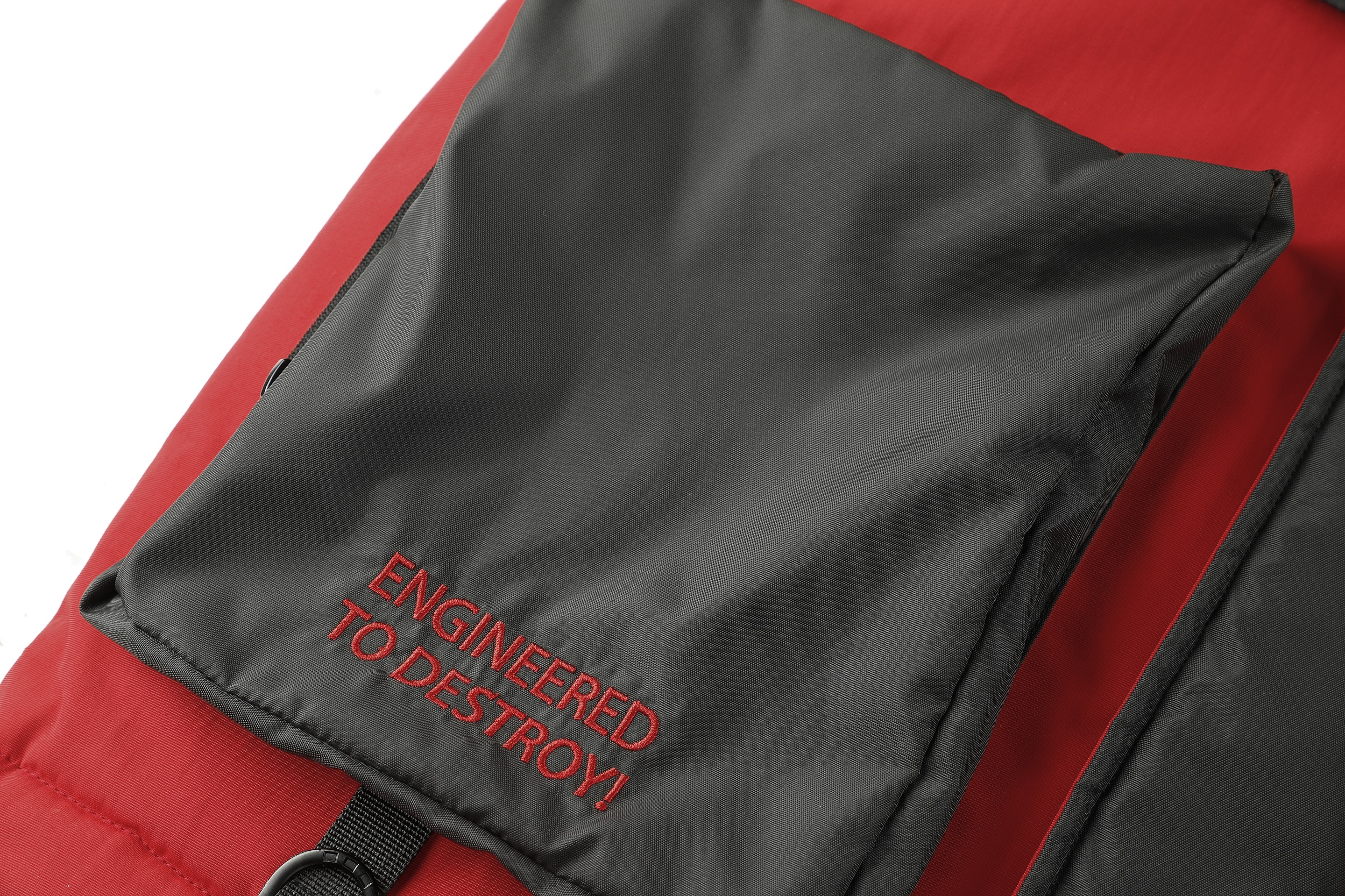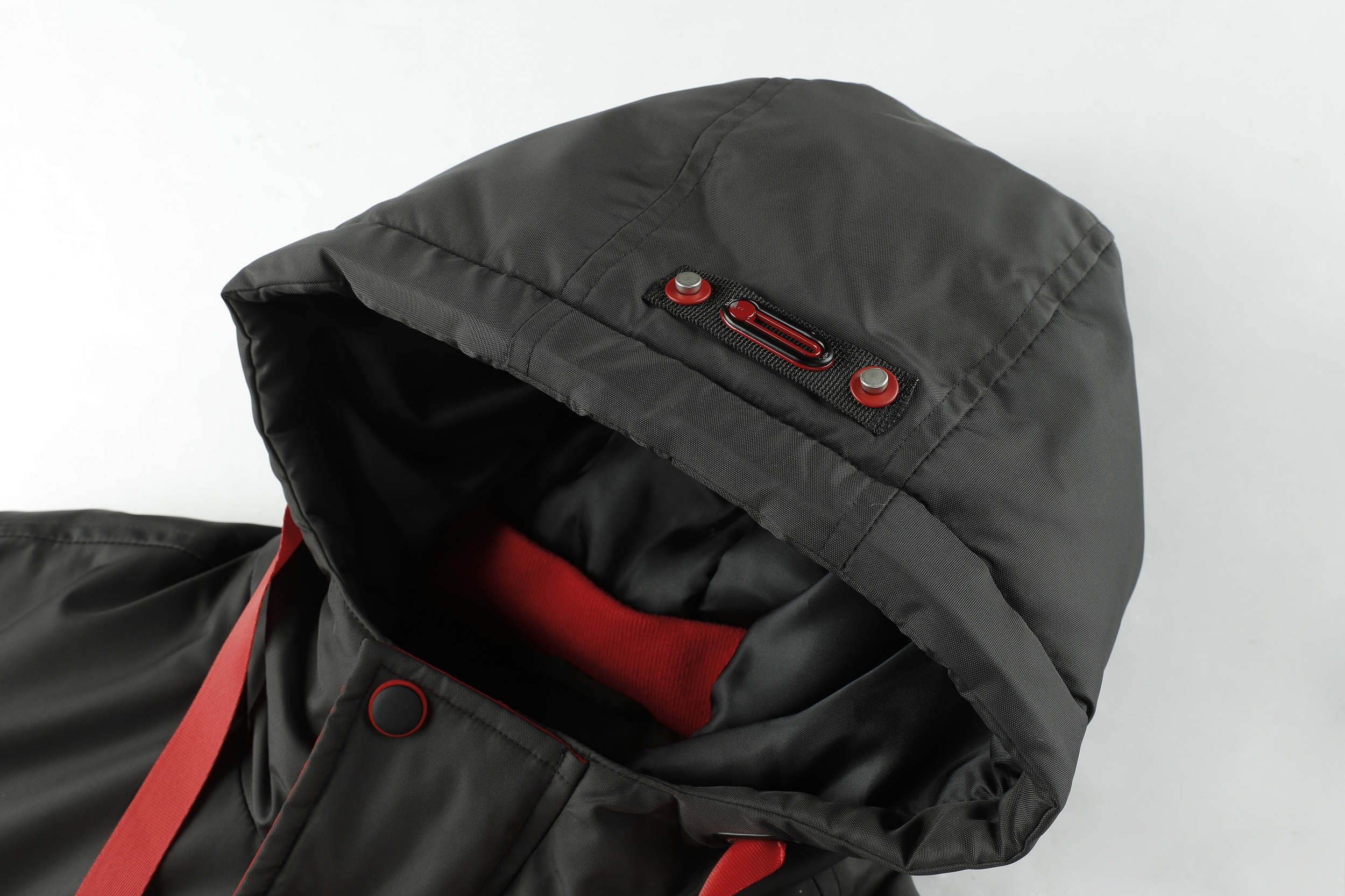 .The jacket features a hood with a fur-like trim and a front zipper. It has a color-block design with red as the primary color and black accents. The jacket includes multiple pockets, with two large black pockets on the front and additional zippered pockets. The cuffs appear to be adjustable, and there's a logo patch on the left chest area. The platform provides a 360-degree view option, allowing customers to examine the jacket from all angles. This jacket seems designed for cold weather, offering both warmth and style. It's suitable for outdoor activities or casual wear.