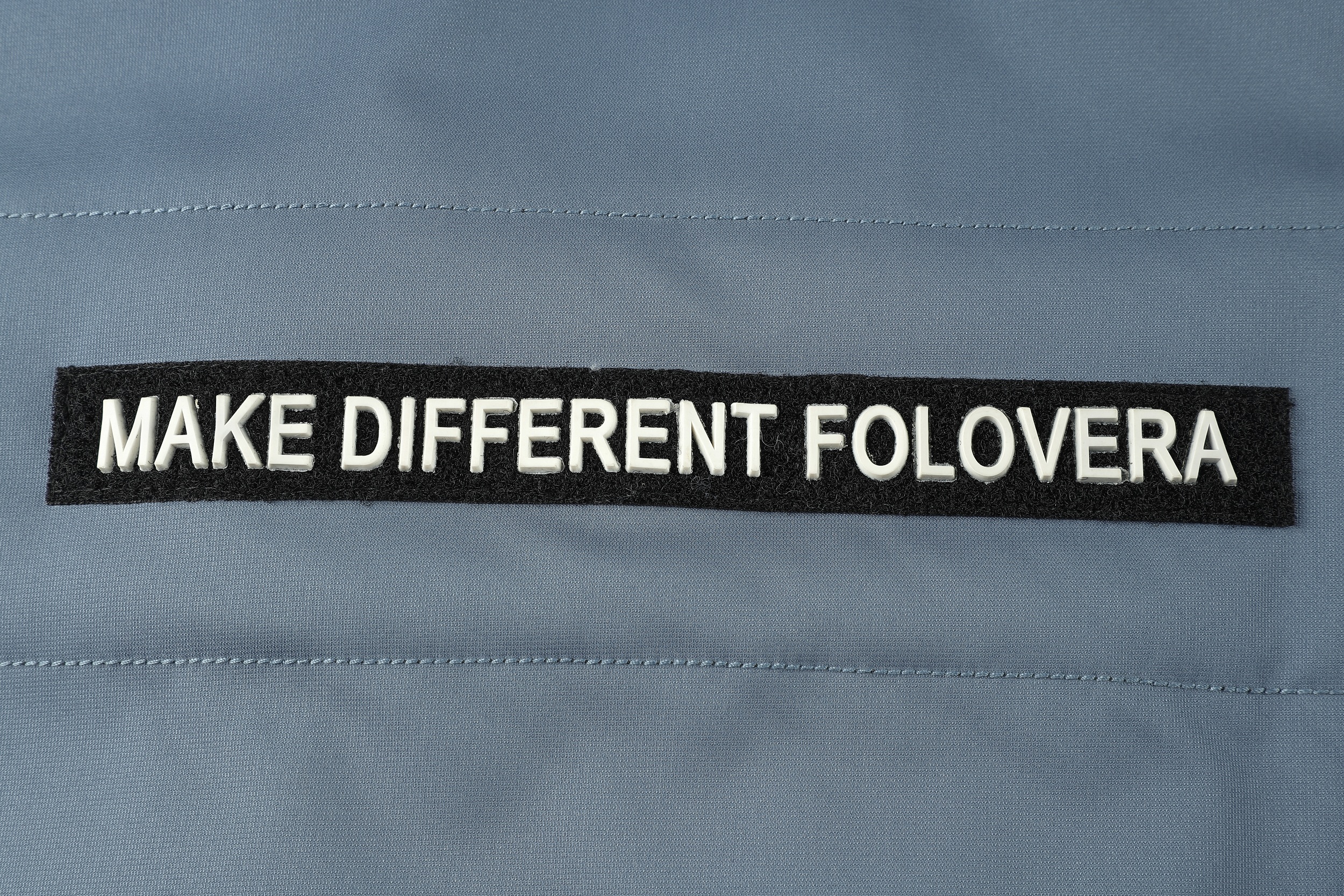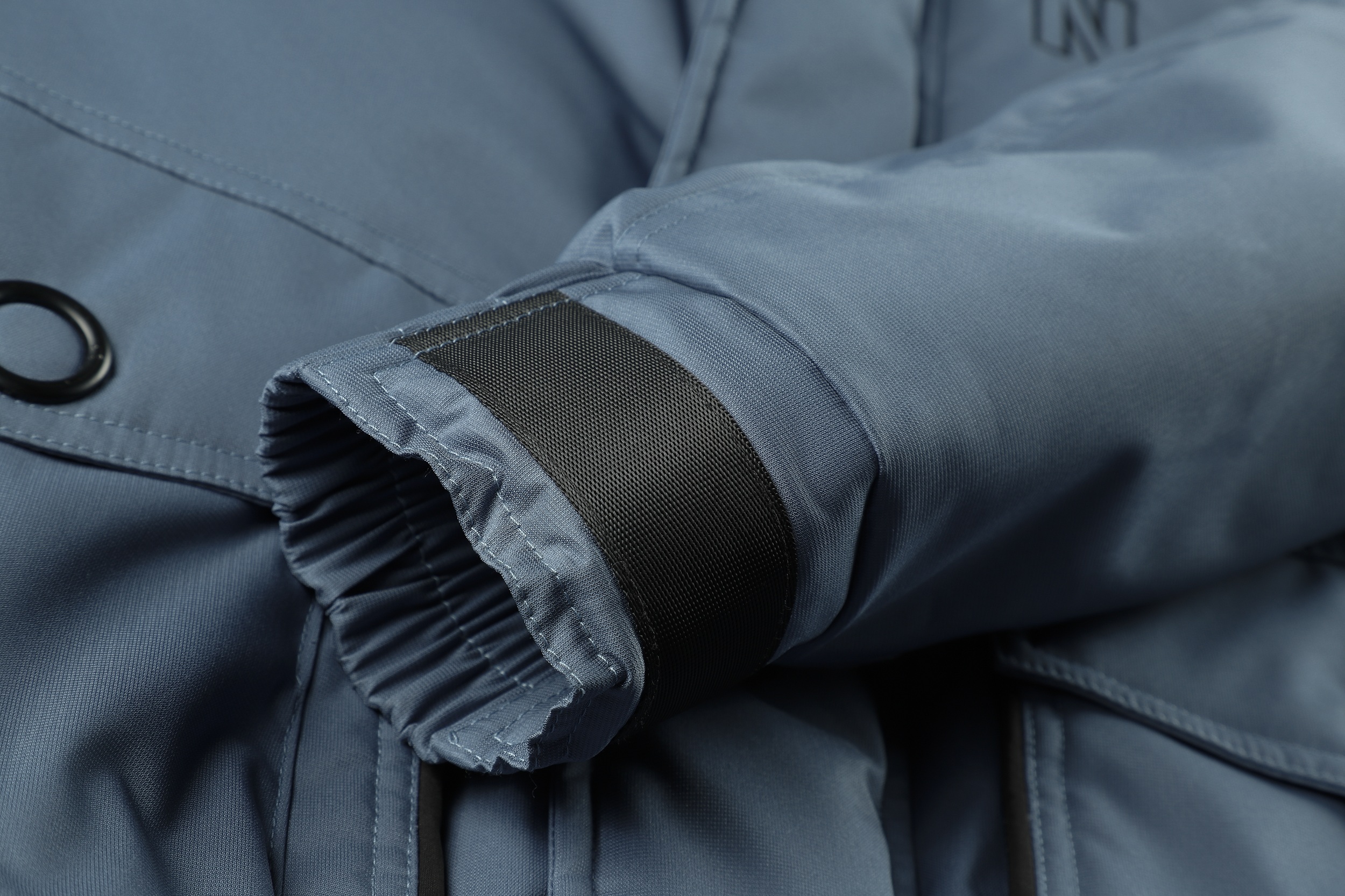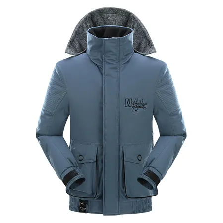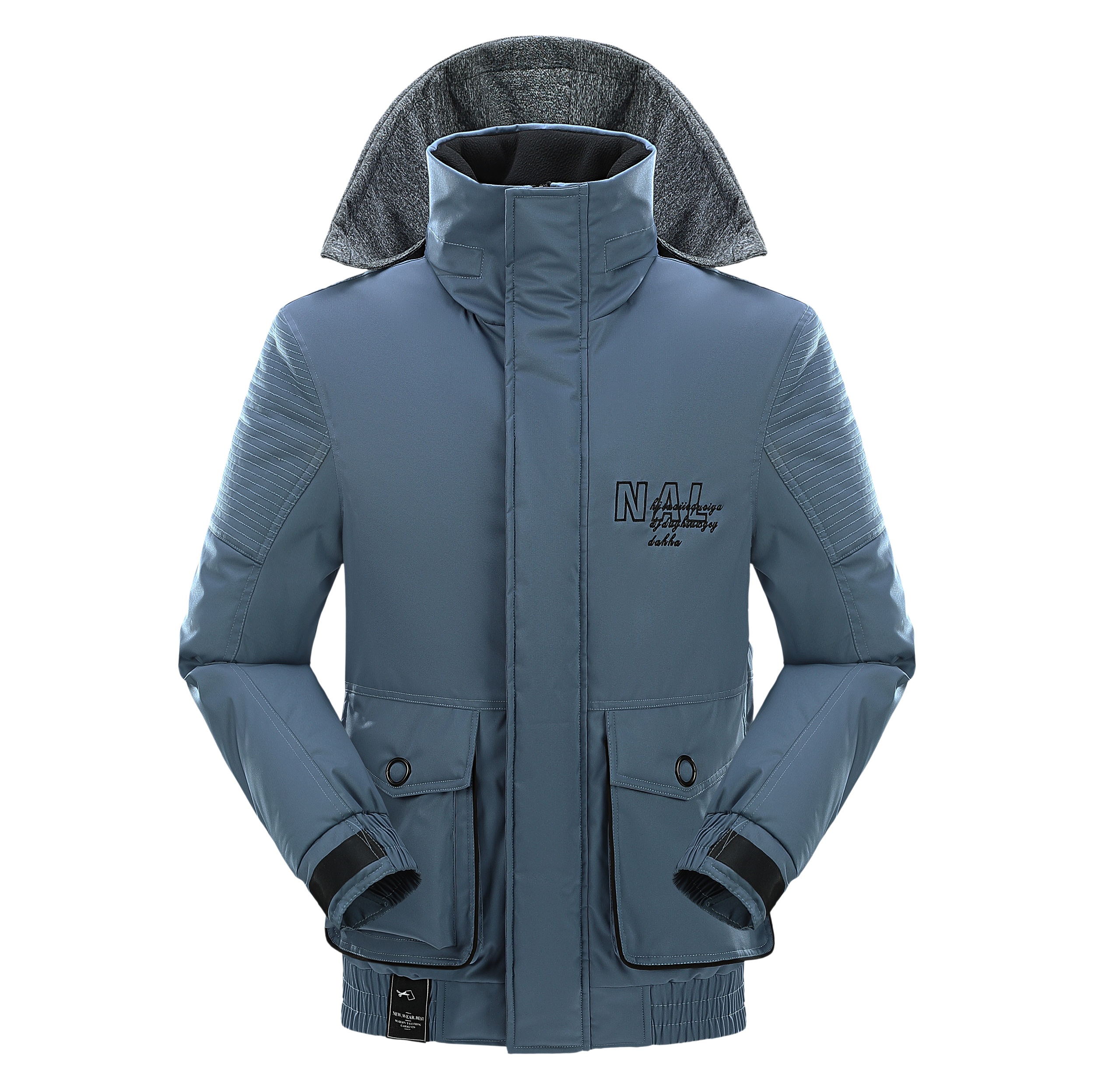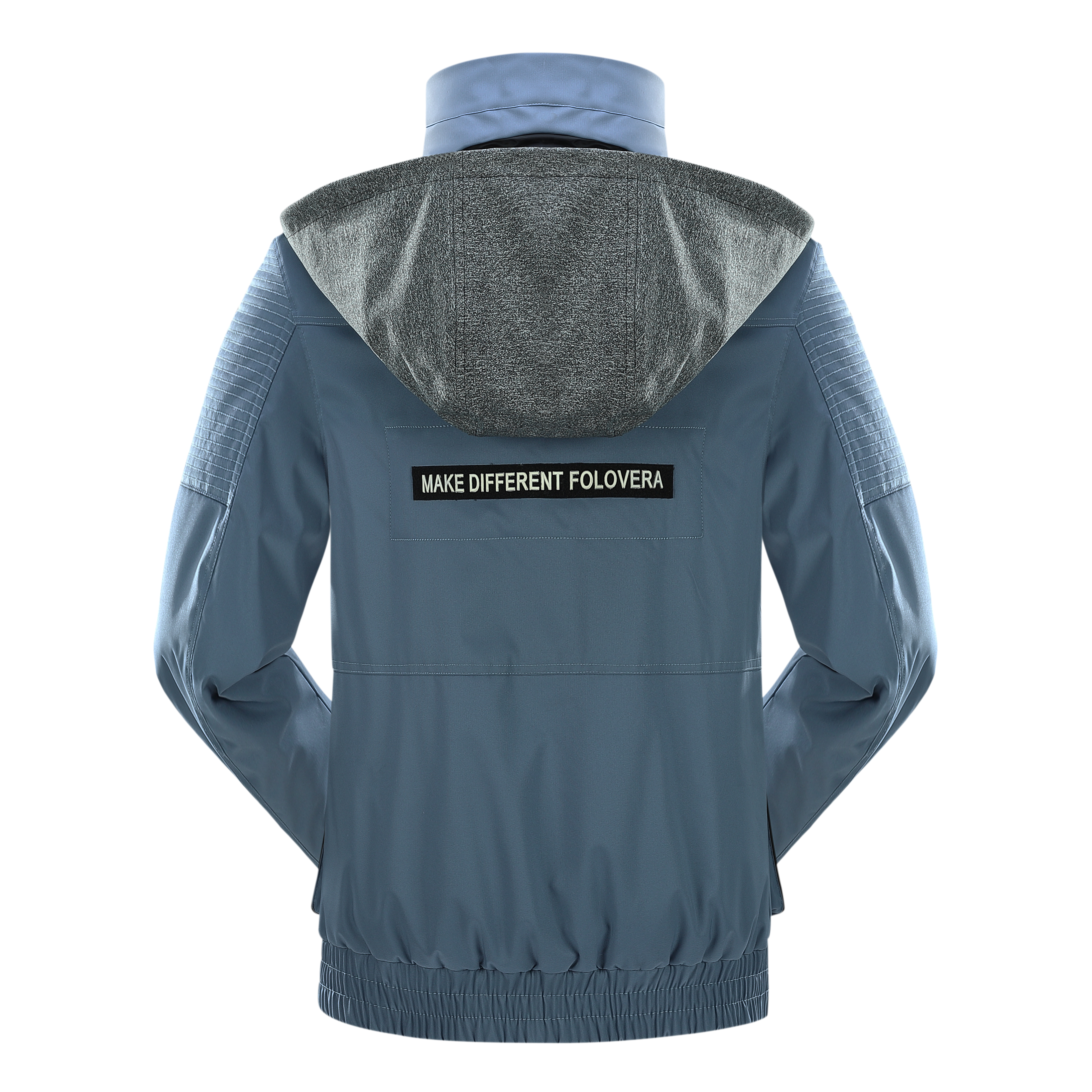 This jacket is designed with a high collar and a front zipper, providing a streamlined look. It includes a detachable hood, offering versatility in wear. The jacket is equipped with multiple pockets: two large lower pockets with flaps and buttons, and two chest pockets with zippers, enhancing its functionality. The cuffs appear to be adjustable, likely with hook and loop tape straps, which helps in retaining warmth. The fabric seems durable and suitable for cooler weather. Notably, the jacket is branded with a logo on the left chest and a text logo across the chest, indicating its brand identity. This jacket is practical for outdoor activities or casual wear, offering both style and utility.