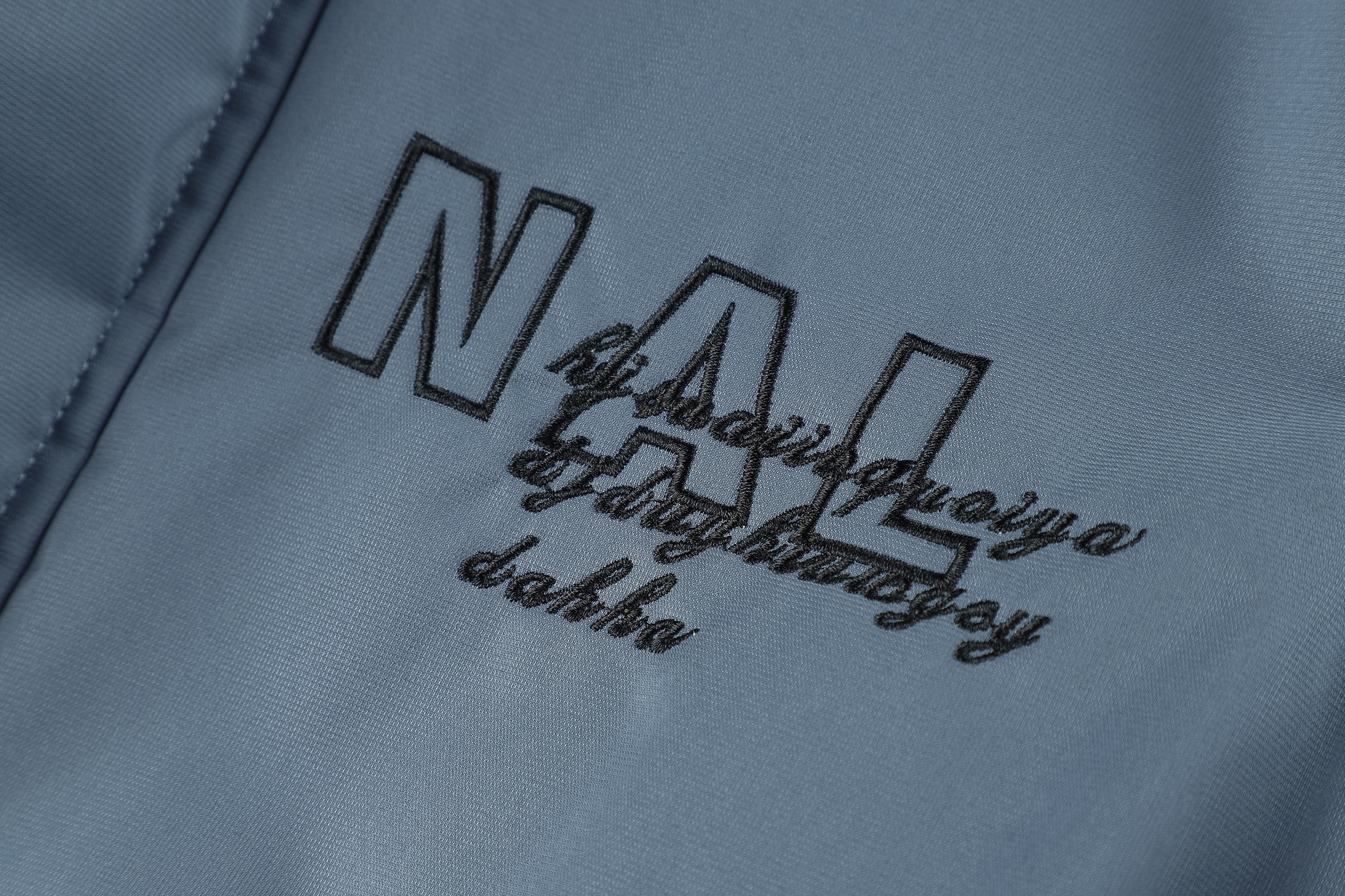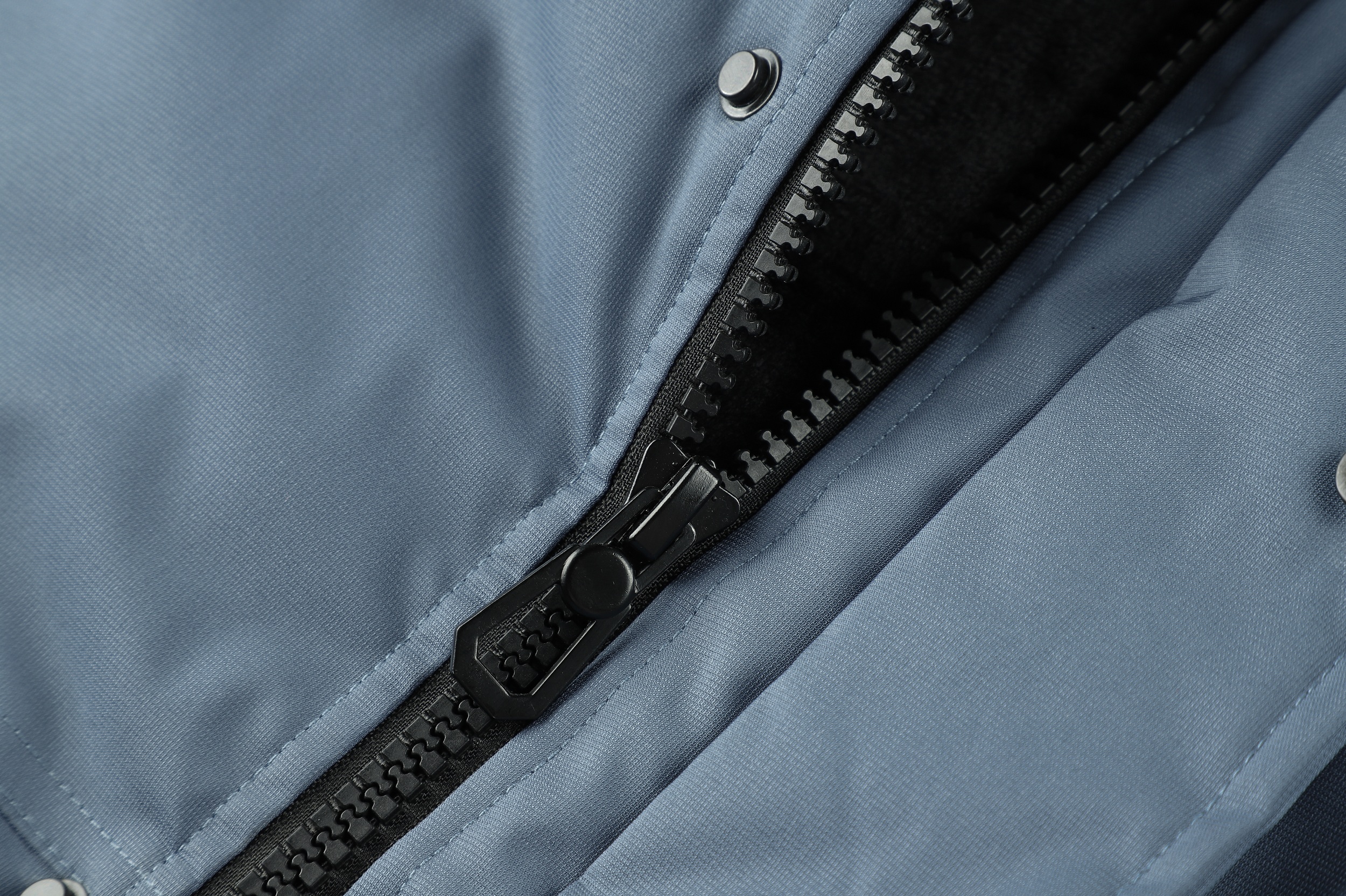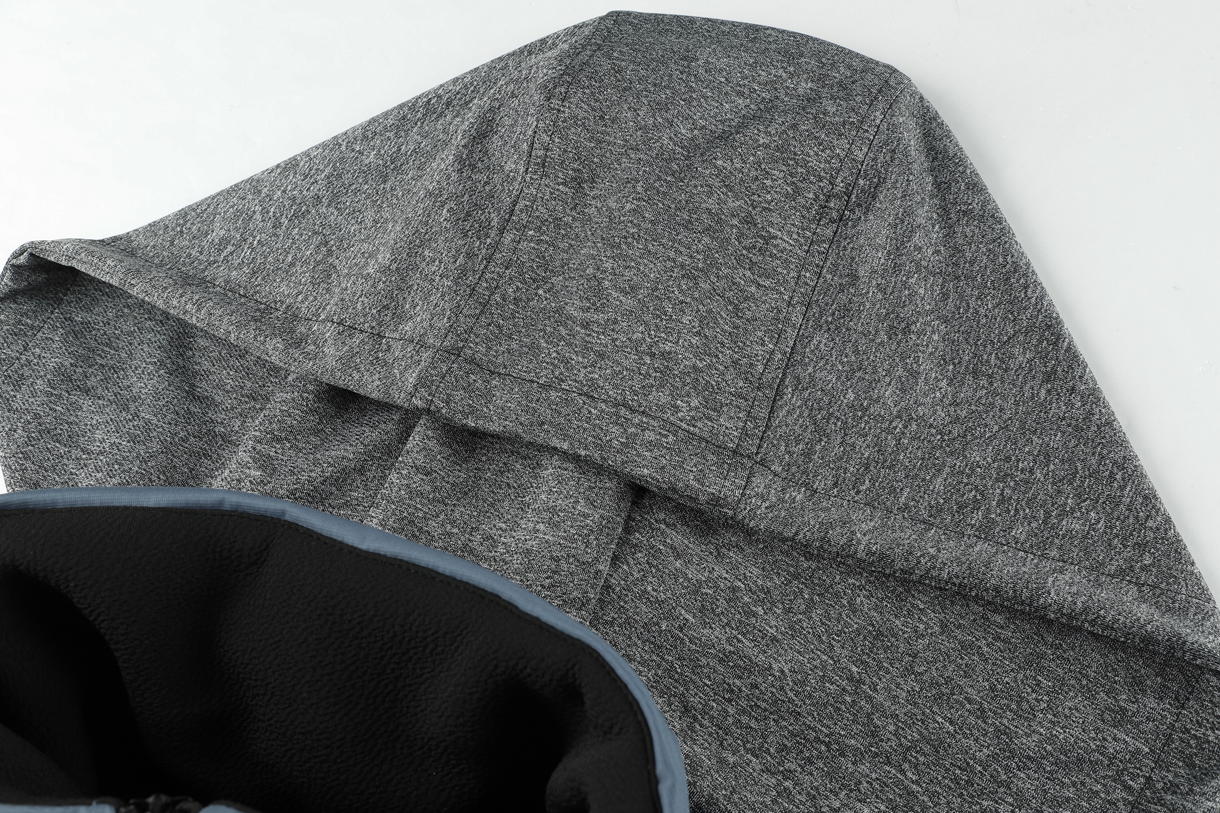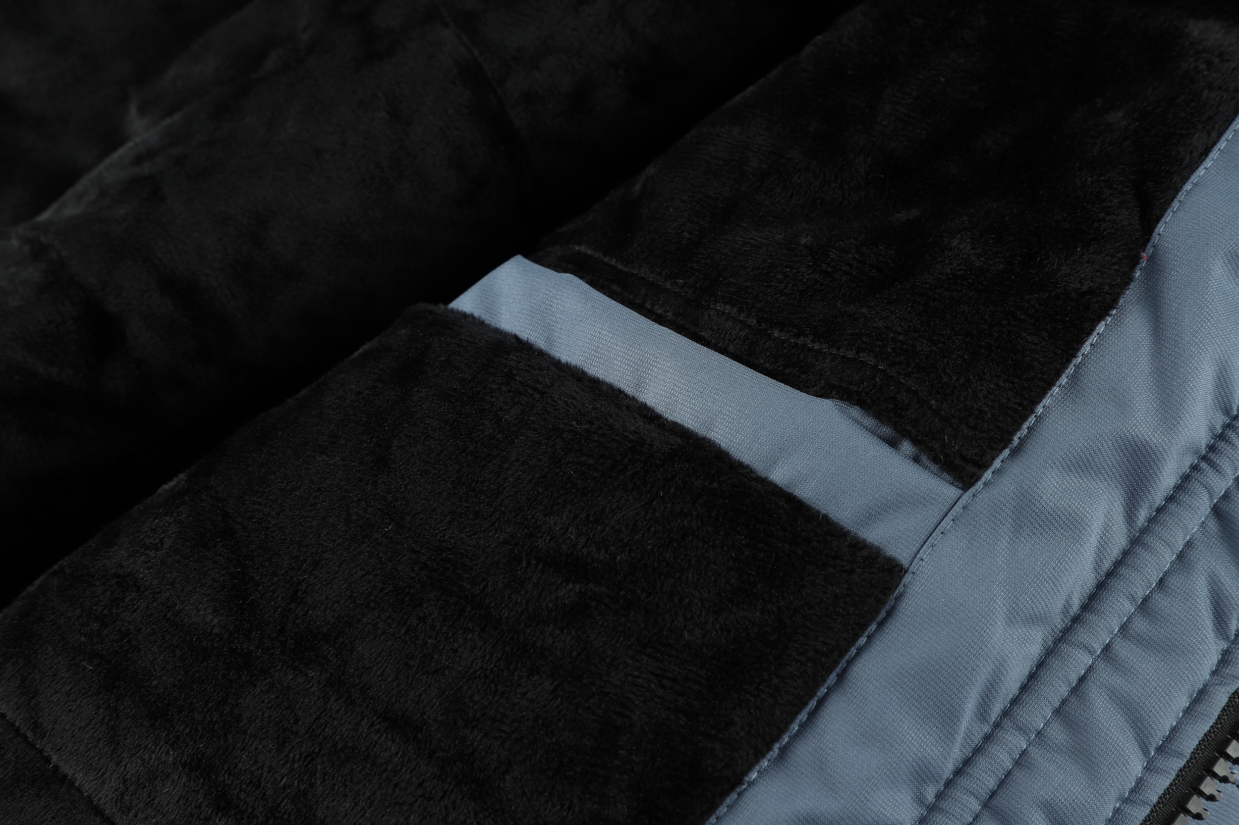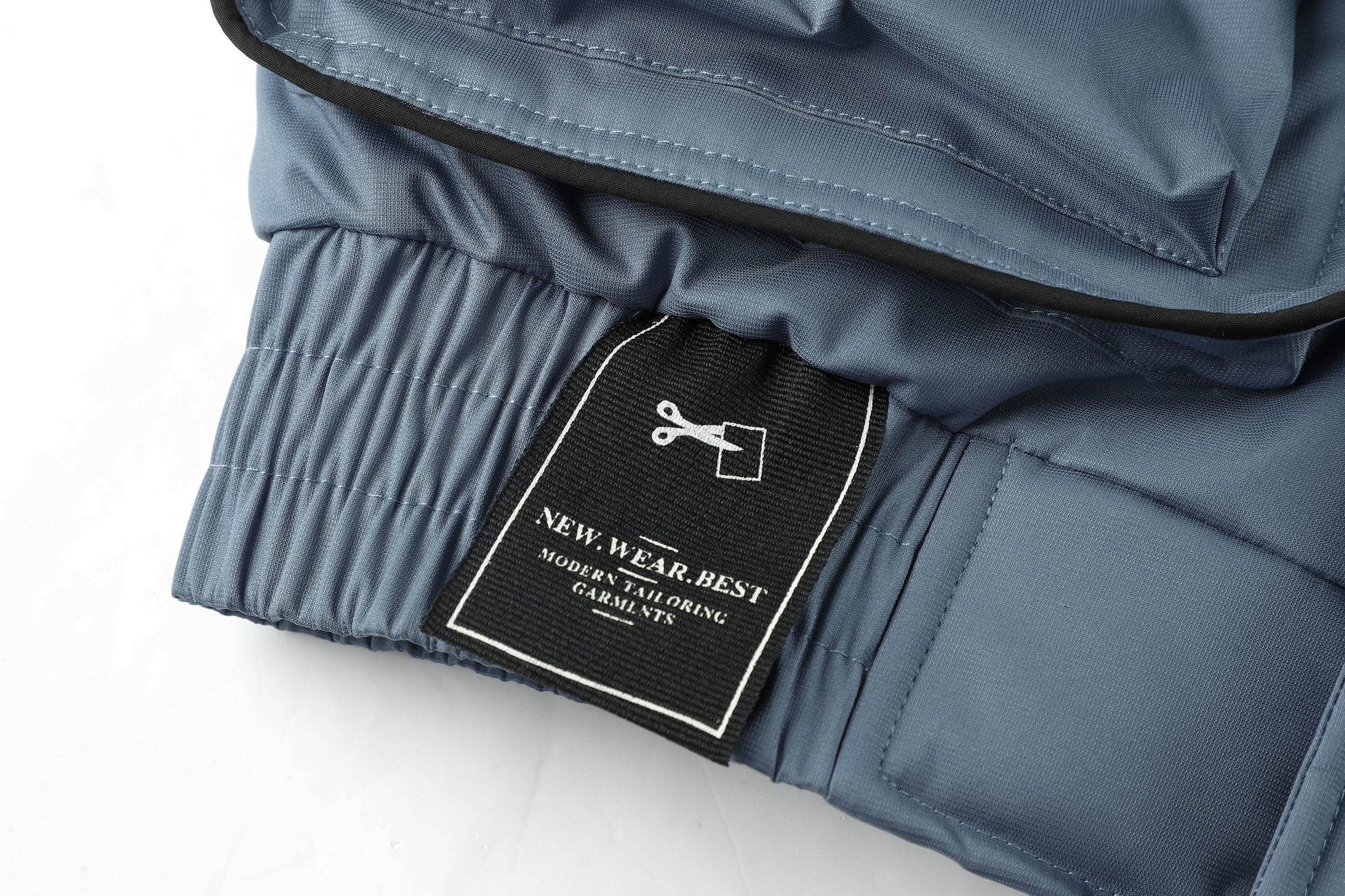 This jacket is designed with a high collar and a front zipper, providing a streamlined look. It includes a detachable hood, offering versatility in wear. The jacket is equipped with multiple pockets: two large lower pockets with flaps and buttons, and two chest pockets with zippers, enhancing its functionality. The cuffs appear to be adjustable, likely with hook and loop tape straps, which helps in retaining warmth. The fabric seems durable and suitable for cooler weather. Notably, the jacket is branded with a logo on the left chest and a text logo across the chest, indicating its brand identity. This jacket is practical for outdoor activities or casual wear, offering both style and utility.
