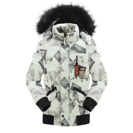 The jacket features a fur-lined hood, adding both warmth and style. It has a front zipper and multiple pockets, including two chest pockets and two side pockets, all with secure zippers. The jacket also includes adjustable cuffs and a hem, enhancing its fit and insulation properties. Red accents are visible on the zipper pulls and a patch on the left chest, providing a striking contrast to the camouflage pattern. The platform offers a 360-degree view feature, allowing potential buyers to inspect the jacket thoroughly. This jacket is designed for cold weather, offering both style and practicality, making it suitable for outdoor activities or casual wear.