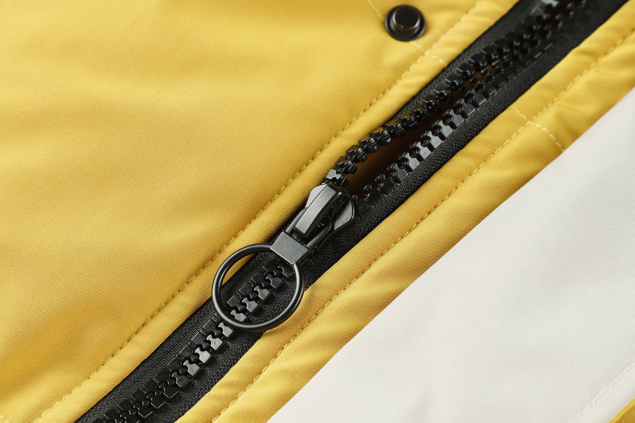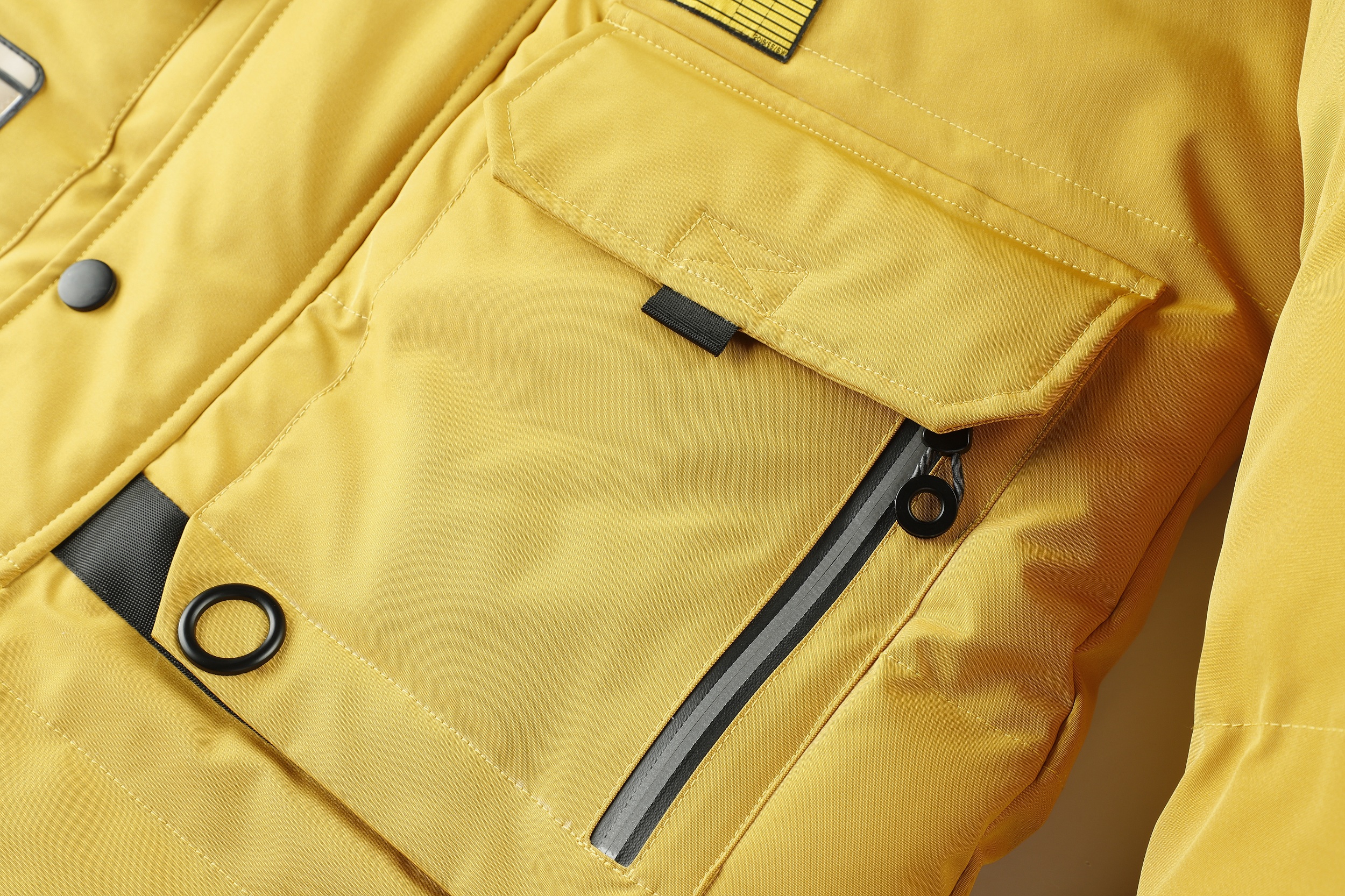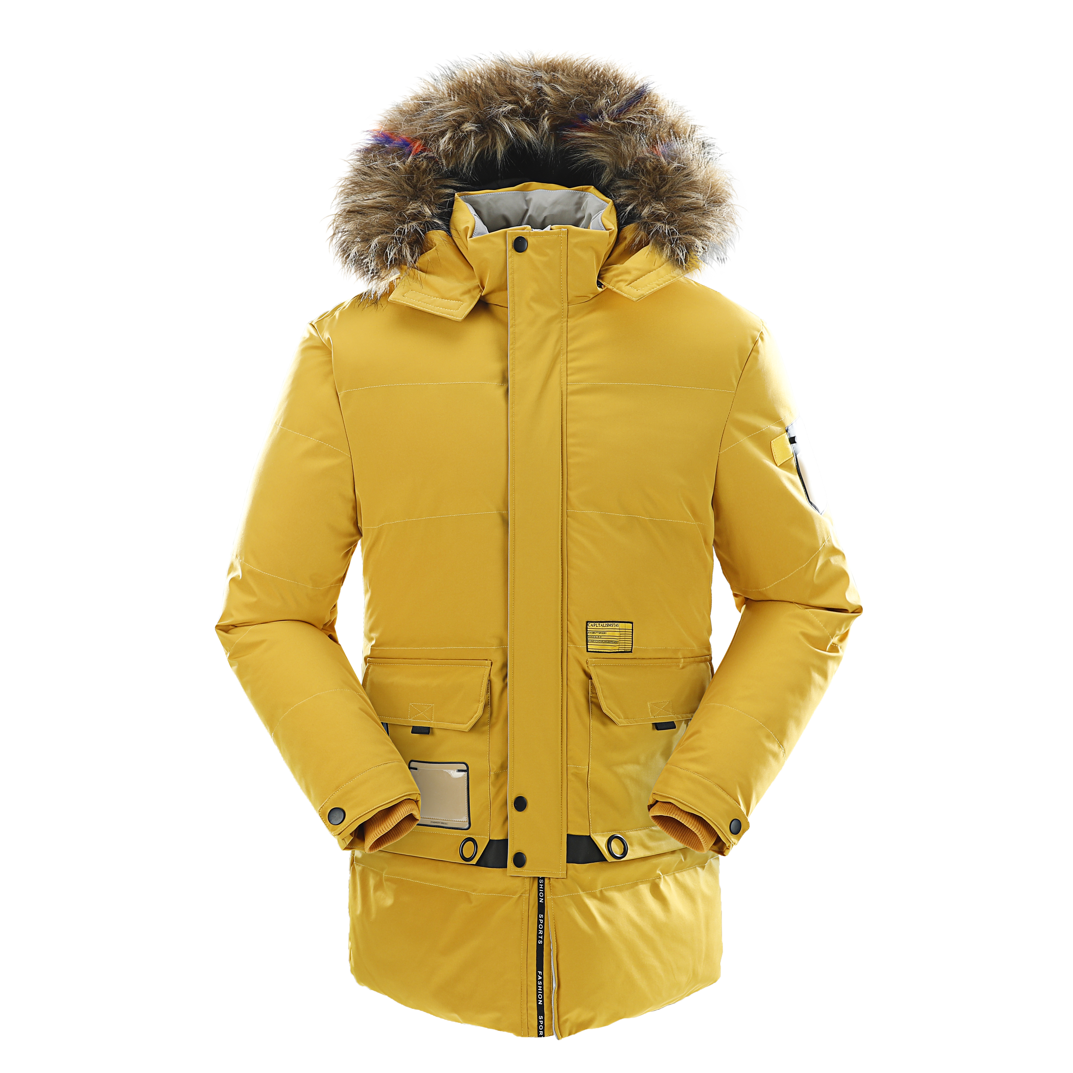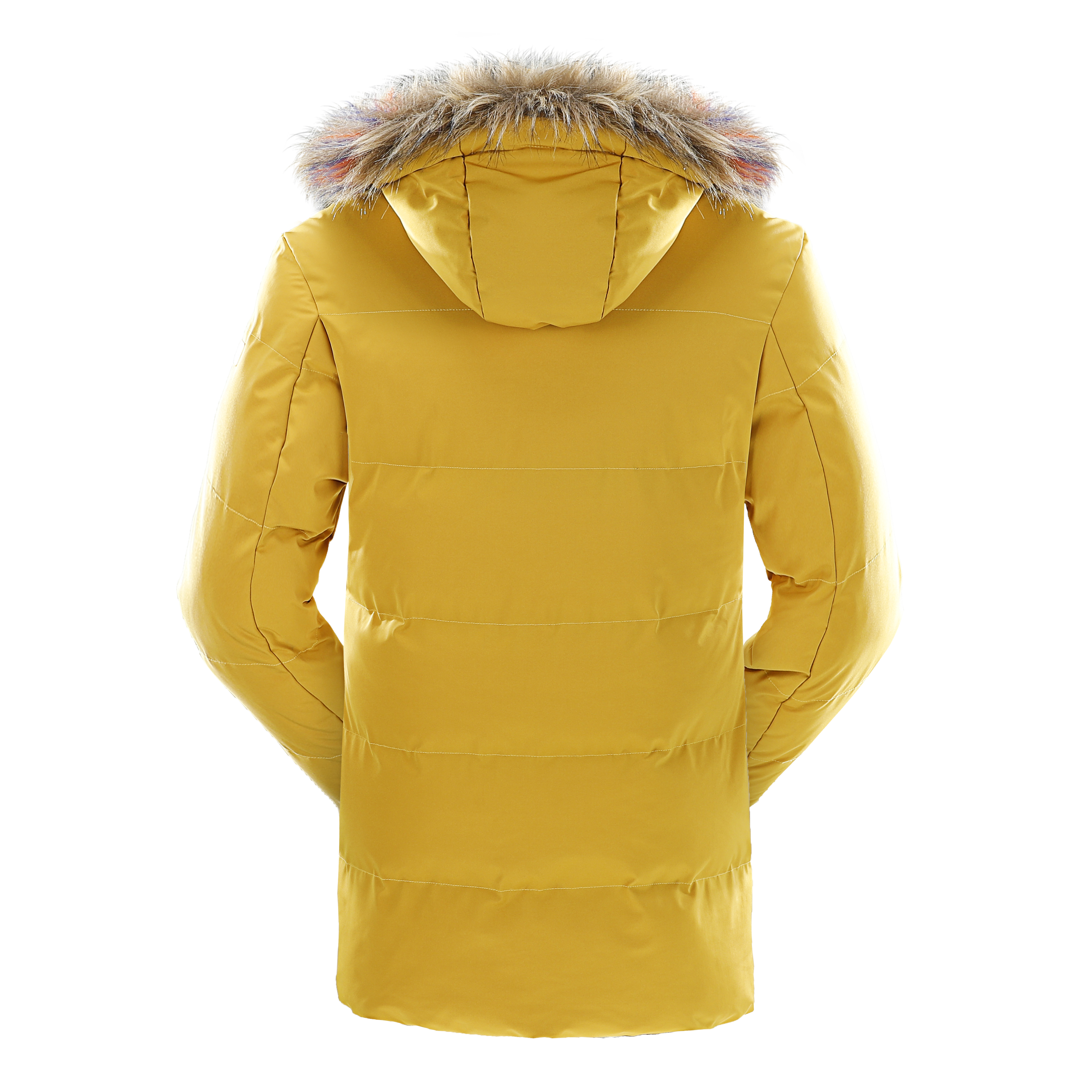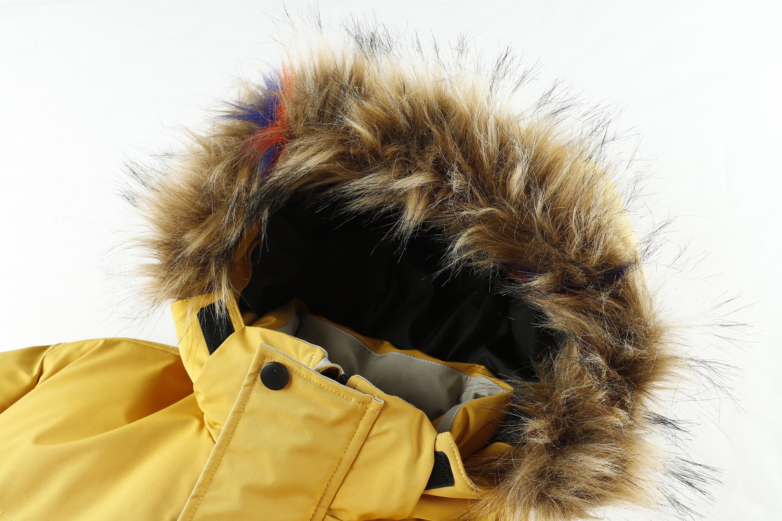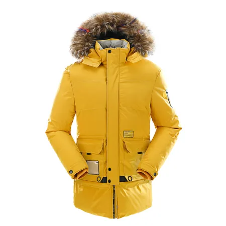 The jacket features a fur-lined hood, which adds a stylish and functional touch, providing warmth and protection against cold weather. It has a zippered front closure, ensuring a secure fit and easy access. The jacket also includes several pockets, likely for practical storage of items. The design appears to be modern and suitable for outdoor activities in cold climates. The overall look is vibrant and eye-catching, making it a statement piece for winter fashion. The jacket's material seems to be sturdy and possibly waterproof, ideal for snowy or rainy conditions. This garment would be perfect for those looking for both style and functionality in their winter wardrobe.