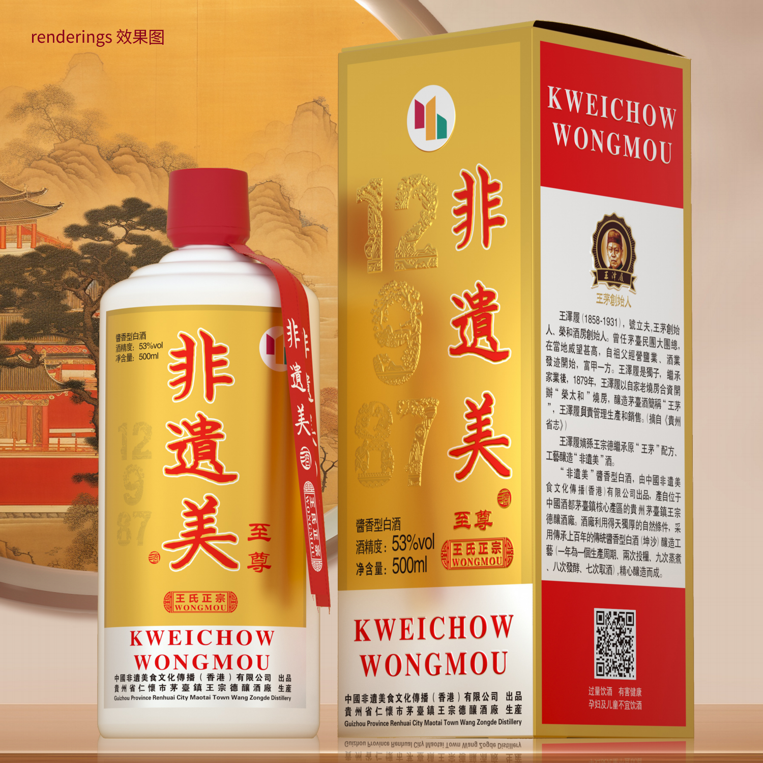 "Intangible Cultural Heritage Beauty" sauce-flavored liquor,Branded new name WONGMOU, produced by China Guizhou Maotai Town Ronghe Distillery (Hong Kong) Co., Ltd., is sourced from Wang Zongde Distillery in Maotai Town, the core production area of China's liquor capital. The distillery leverages its unique natural conditions and employs the traditional sauce-flavored liquor (Kunsha) brewing technique, which has been passed down for over a century (one production cycle per year, two grain inputs, nine steams, eight fermentations, and seven distillations), to craft this exquisite liquor.