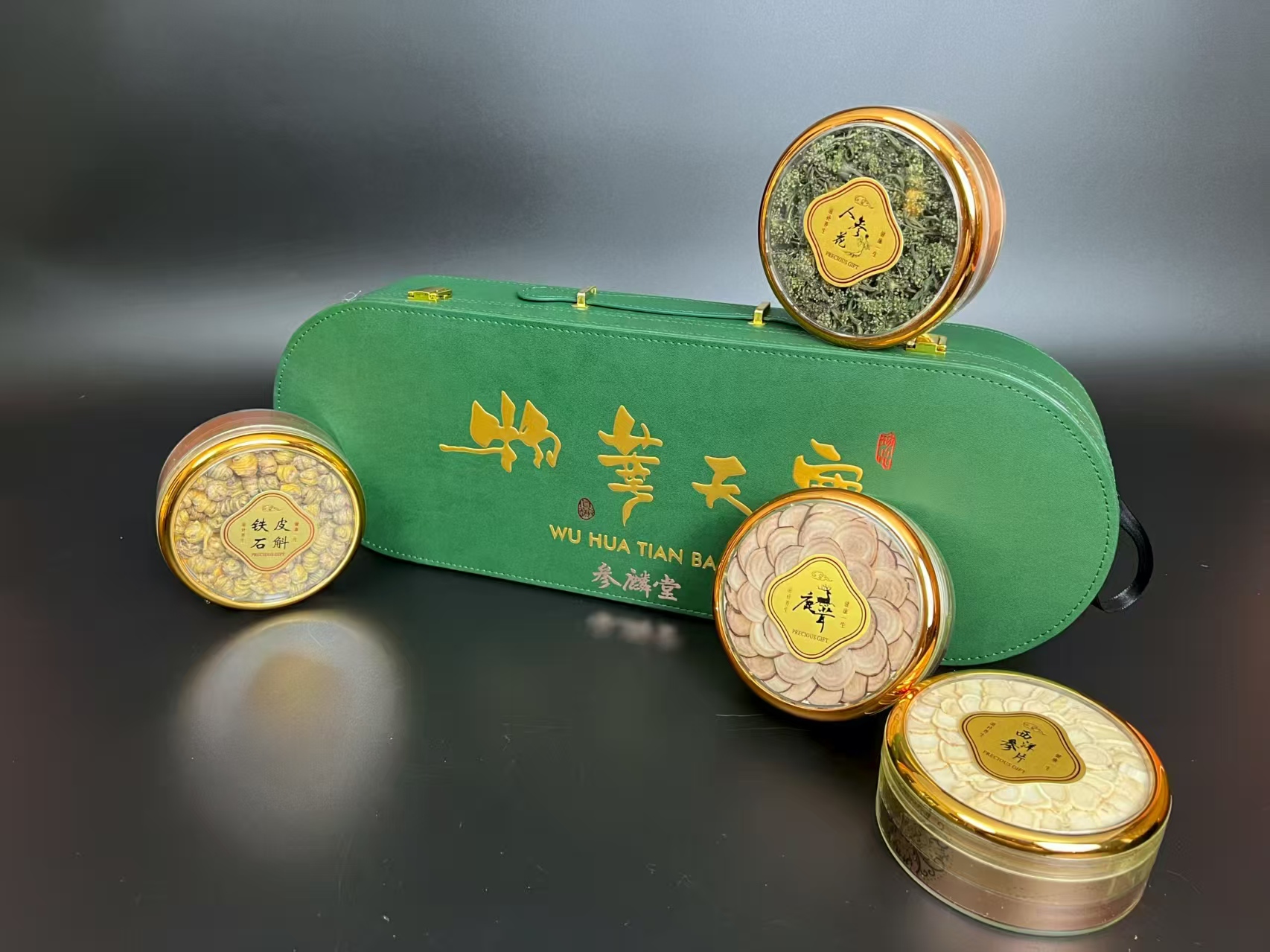 WU HUA TIAN BAO: American ginseng slices, Ginseng flowers, Deer antler, Dendrobium officinale.