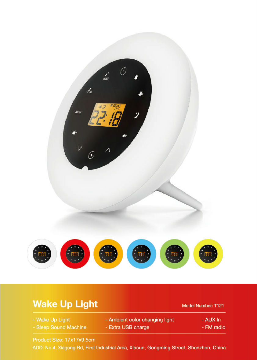 Touch Key Control Simulated Wake up light Sleep therapy light to help heavy sleepers White noise sound PLL FM Radio Mood light with 7 color changing light 8 kind of nature sounds USB Charging Function Aux in function for speaker Time, Date, Alarm, Snooze function LCD Brightness adjustable