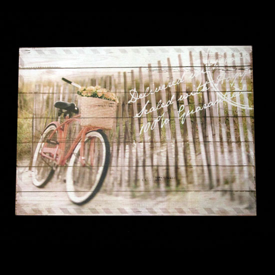 This piece of printed wall art features a bicycle with a basket of flowers leaning on a fence, creating a relaxing atmosphere. The white cursive lettering lends extra appeal. Spice up your home décor with an artistic aura with this gorgeous art piece.