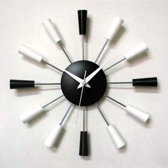 This wall clock features a trendy style, with mainly black and white colour making a strong contrast. Besides the colour making it outstanding, its has a special design similar to a sun. It does not have readings on it which makes it more unique. It matches best in trendy homes or offices.
