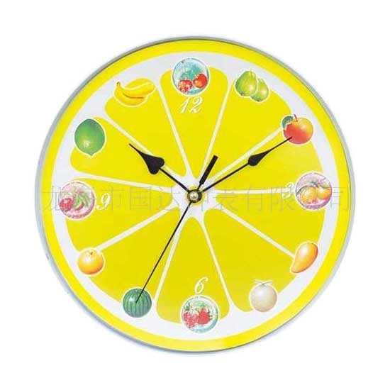 The wall clock comes in an eye-catching yellow color with a lemon's profile print. The clock showcases three clock hands and it has fruit patterns as hour markers. This wall clock adds decorative flair to your home instantly.