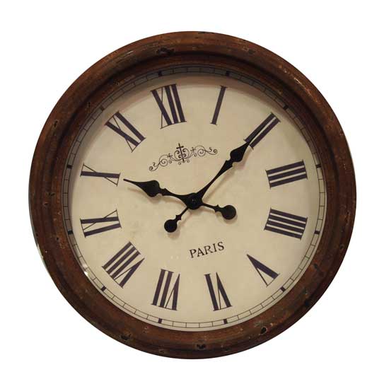 This wall clock features a round dial with classic flair. The black hands and Roman numerals stand out from the clean white dial, allowing easy reading. The brown wooden bezel with a raw finish helps convey a nostalgic touch.