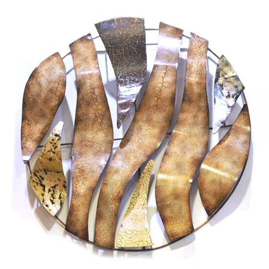 This is a wall decoration. The wall decoration is circular and constructed of tin and coconut twigs. It features a raised mosiac pattern of various plants.