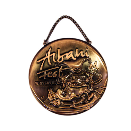 This round-shape bronze wall decoration features elaborate graphics and words. Attached with a short chain in the same color, you can hang this plate on any wall. With a special design, this adornment makes a stylish addition to your home decor.