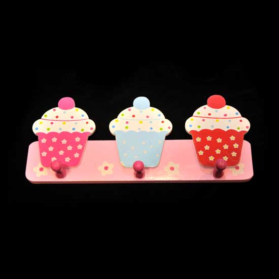 This highlighted wall-mounted hanger comes with three hooks. Each hook is accented with a colorful cupcake ornament for a lovely accent. This adorable wall hanger is a great choice for a girl’s room.