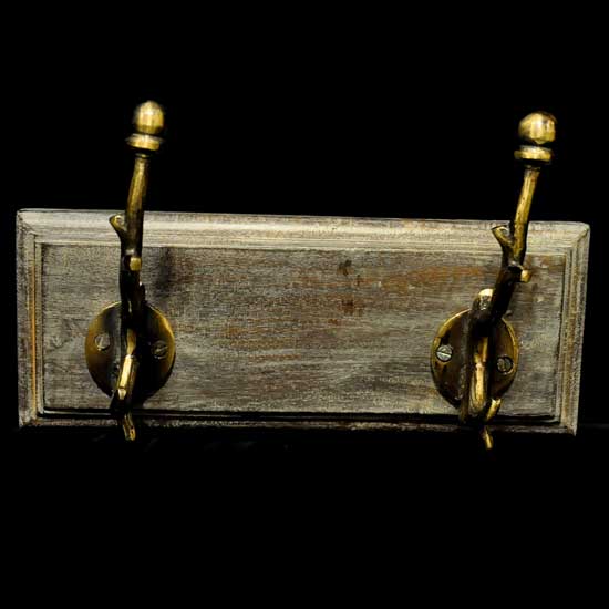 Displayed here is a durable household hook that is made of wooden and metal materials. This excellent hook is crafted with a wooden base and two metal hooks in golden plating. Add this to your home for a touch of elegance.