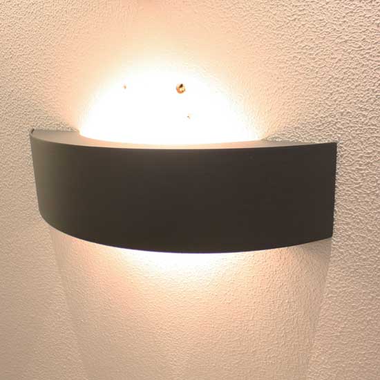 This wall lamp features a horizontal arc design in gray, conveying a simplistic and contemporary vein. The lamp is powder-coated with pretreatment for outdoor use. Made of die-cast aluminum, the chic wall lamp promises rugged construction and first-rate durability.