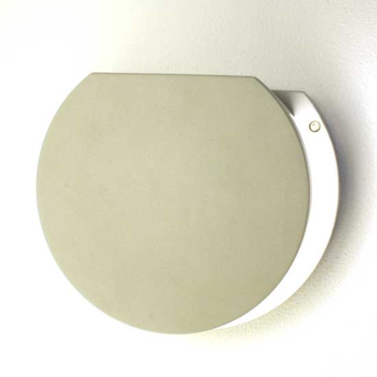 This wall lamp features a cut circle design in light gray with silver-tone metallic details on the right side, conveying a simplistic and contemporary vein. The lamp is powder-coated with pretreatment for outdoor use. Made of die-cast aluminum, the chic wall lamp promises rugged construction and first-rate durability.