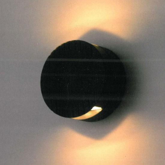 This round wall lamp is enclosed in a durable black-hued housing. It emits light from two directions for a great lighting effect. This high quality wall lamp is easy to install.