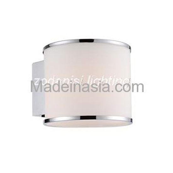 This is a wall-mounted lamp featuring a metal structure with chrome painting. It comes with a lampshade in white which is made of quality glass. This lamp boasts an elegant and stylish design.