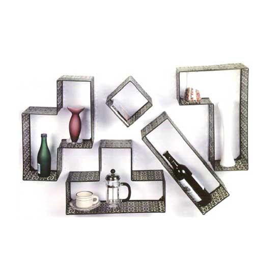 Pictured is a number of wall shelves fashioned into different artistic shapes. Each of these shelves are specially coated with powders. They are nice for holding and displaying wine bottles, tea sets, vases, books, etc.
