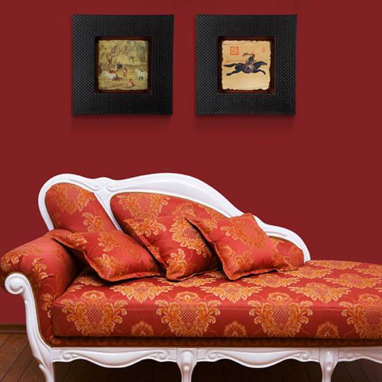 This set of wall decorations demonstrates the fighting spirit of the owner. Inspired by Asian culture and art, these two plaques show pictures of Chinese ancient style, in one of which horses are resting in a forest, while the other one shows a running horse and its rider.