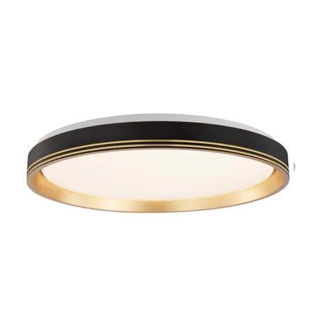 This is a circular ceiling light. The main part of the lamp body's edge is black, decorated with several thin golden lines, adding a sense of refinement. The bottom edge is golden, echoing the central light - emitting area that emits soft warm light. The overall design is simple yet luxurious, suitable for installation in home spaces such as living rooms and bedrooms, and can create a warm and stylish lighting atmosphere, fitting home decoration styles like modern minimalist and light luxury.