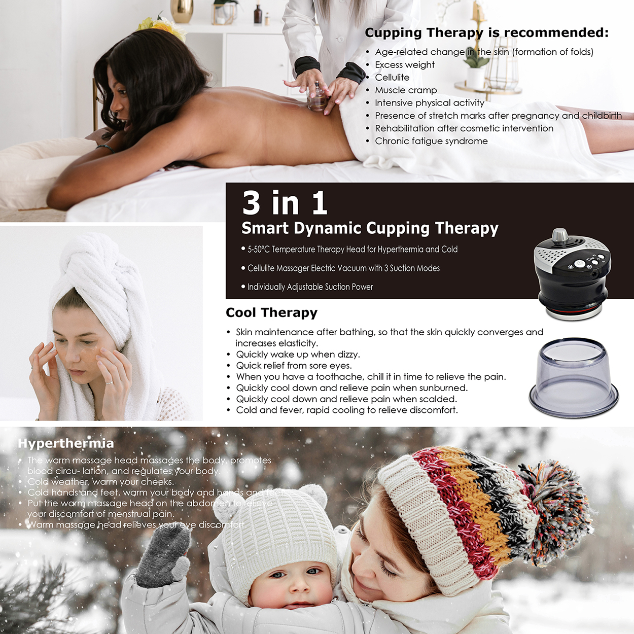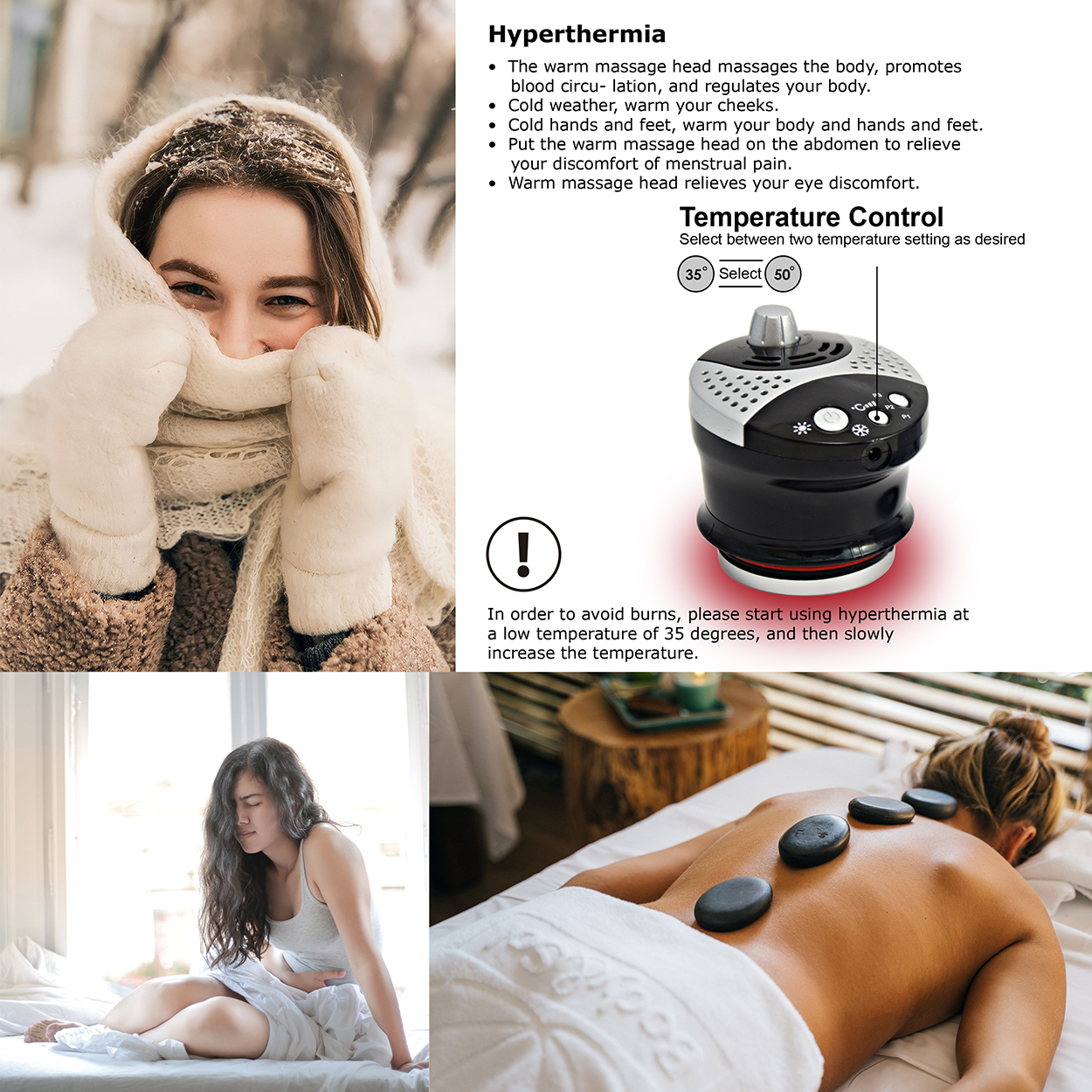 Hyperthermia - Heat therapy can also resolve the discomfort brought about by menstrual cramps. You could place the warm massage head on top of your abdomen then it would soon relieve the pain. The 35-50°C warm head warms your cold cheeks and warms your whole body.