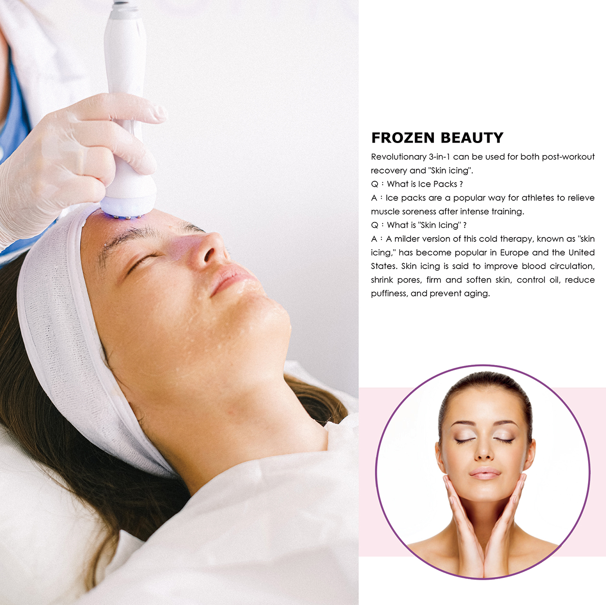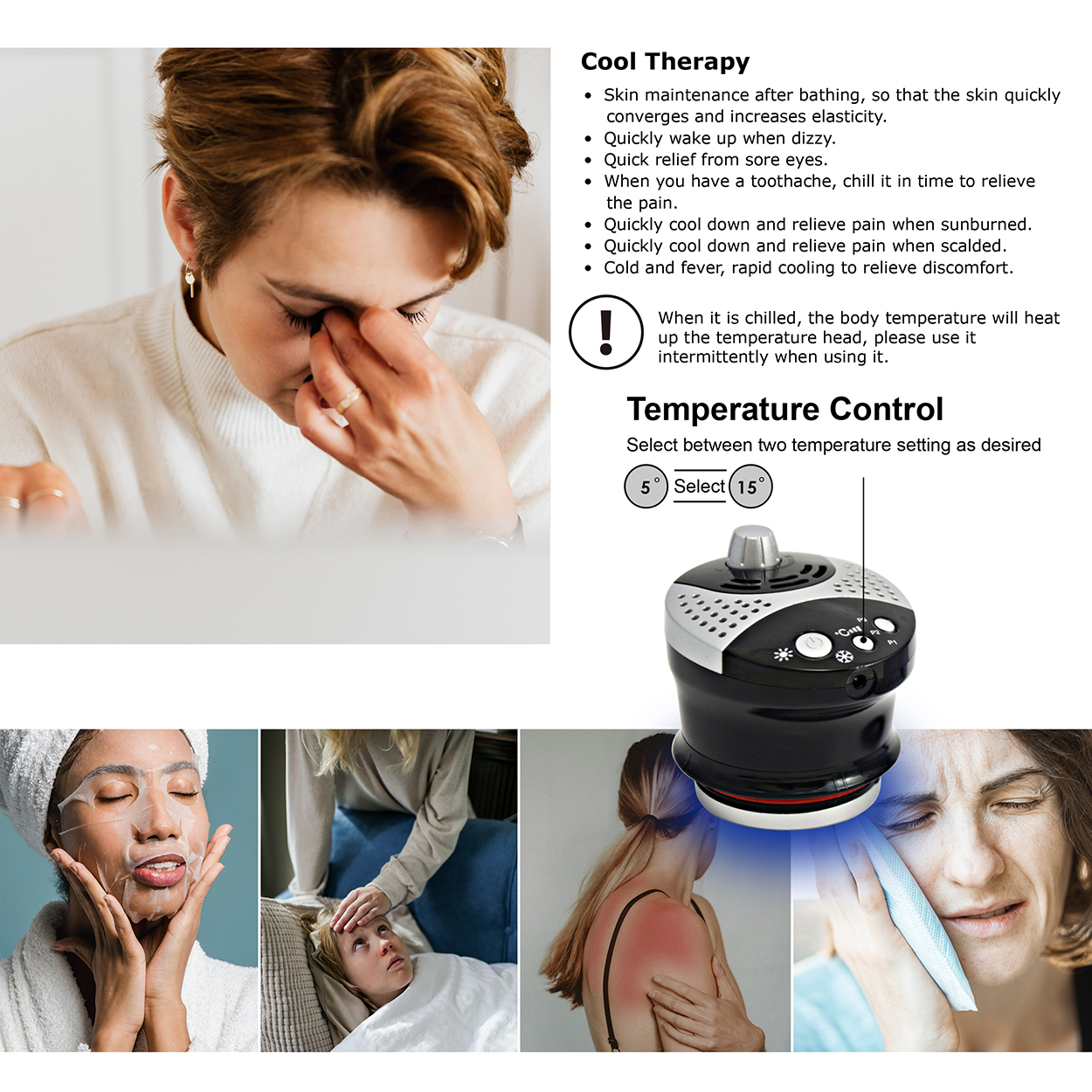 Cold therapy - The major function of cold therapy is to relieve the discomfort and debility caused by a sultry environment. Applying the 5-10°C massage head touch your neck, face, forehead, and eyes will bring you the feeling of remission refresh instantly. Tighten the skin after skin care, leaving the skin firm and elastic. Relieve pain from sunburn, scald, and toothache.