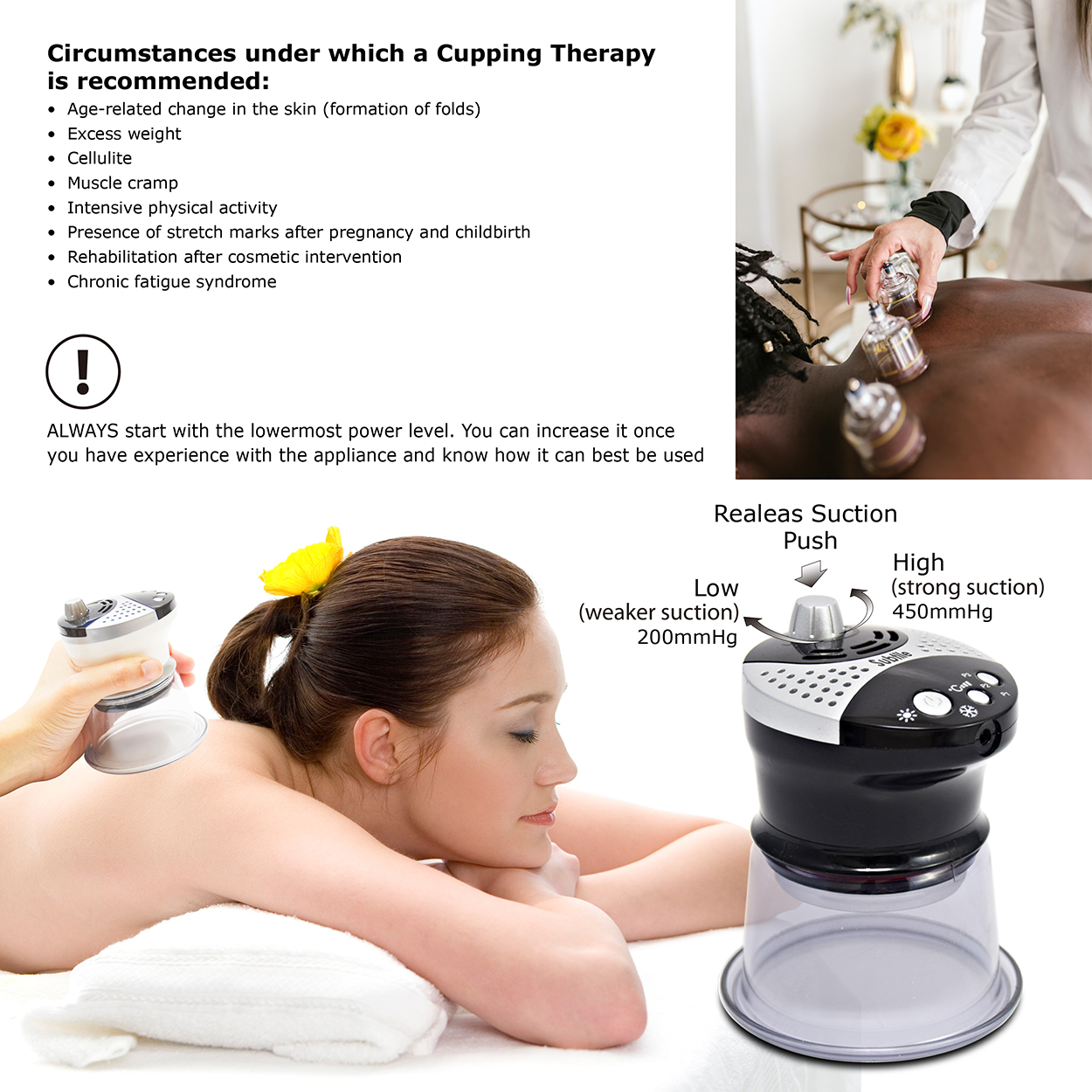 **Individually Adjustable Suction Power –The suction power is from 200 to 450 mmHg under your comfortable choice. Really protect your skin from broken blood vessels on the superficial skin.