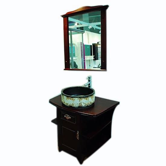 This bathroom furniture set comes with a mirror, a wash basin and a cabinet. The wash basin is decorated with a white splash-ink print while the mirror and cabinet are finished with dark brown color that makes a traditional Chinese architectural flavor. The classic furniture set is an ideal complement to embellish your bathroom.