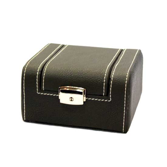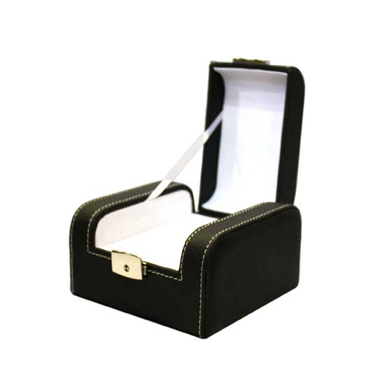 Displayed is a watch box that comes in a classic black color. The box features a partial lid that is fastened with a lock. This watch box is made of high quality material for durability.
