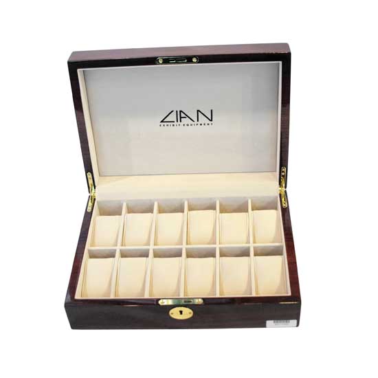 This is a watch box in a rectangular shape in dark brown with a smooth finish. It is designed with 12 individual compartments for storing multiple watches at a time. The soft cushions protect your watches from scratches.