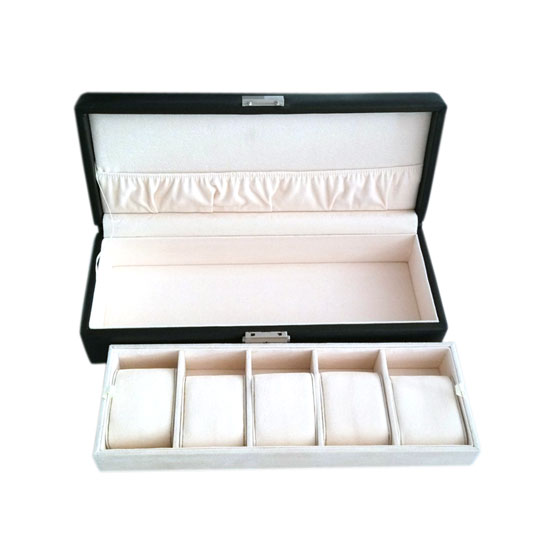 This watch box is made of imitation leather and Claimond veins with a silver lock. Its cover features a pouch for holing rings and other jewelry items. The inside has a tray with 5 pillows.