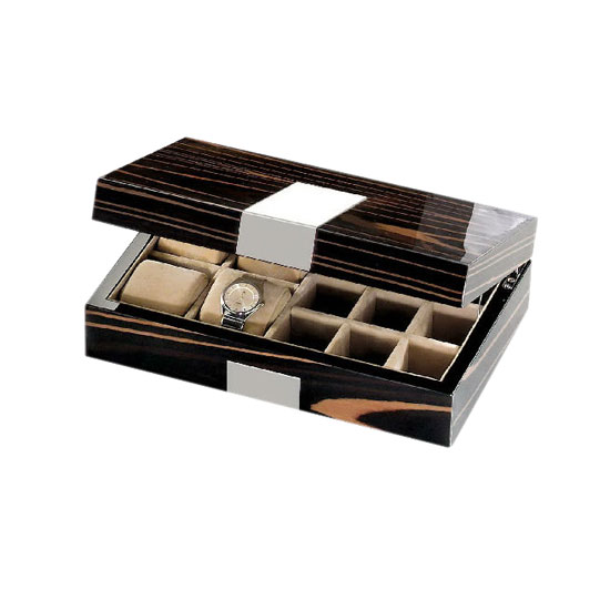 This is a watch box that comes with beautiful wooden patterns. With multiple compartments, this watch box is ideal for storing watches and cuff links. This useful watch box is also available in other colors.