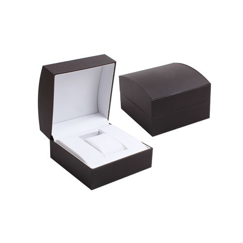This watch box comes in square shape and has a rounded top cover. It has a plastic body wrapped with paper material and has PU lining inside. The watch box has an insert with a removable pillow for watch packaging and is available in various colors.