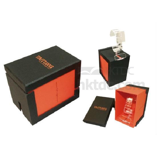 The pictured watch box is rectangular shaped and has a C-ring inside for holding a watch. It has a lid for covering and is printed with brand name on the lid for promotional use. This watch box flaunts a lightweight yet durable construction and looks great in watch showcases.