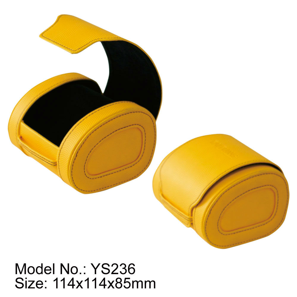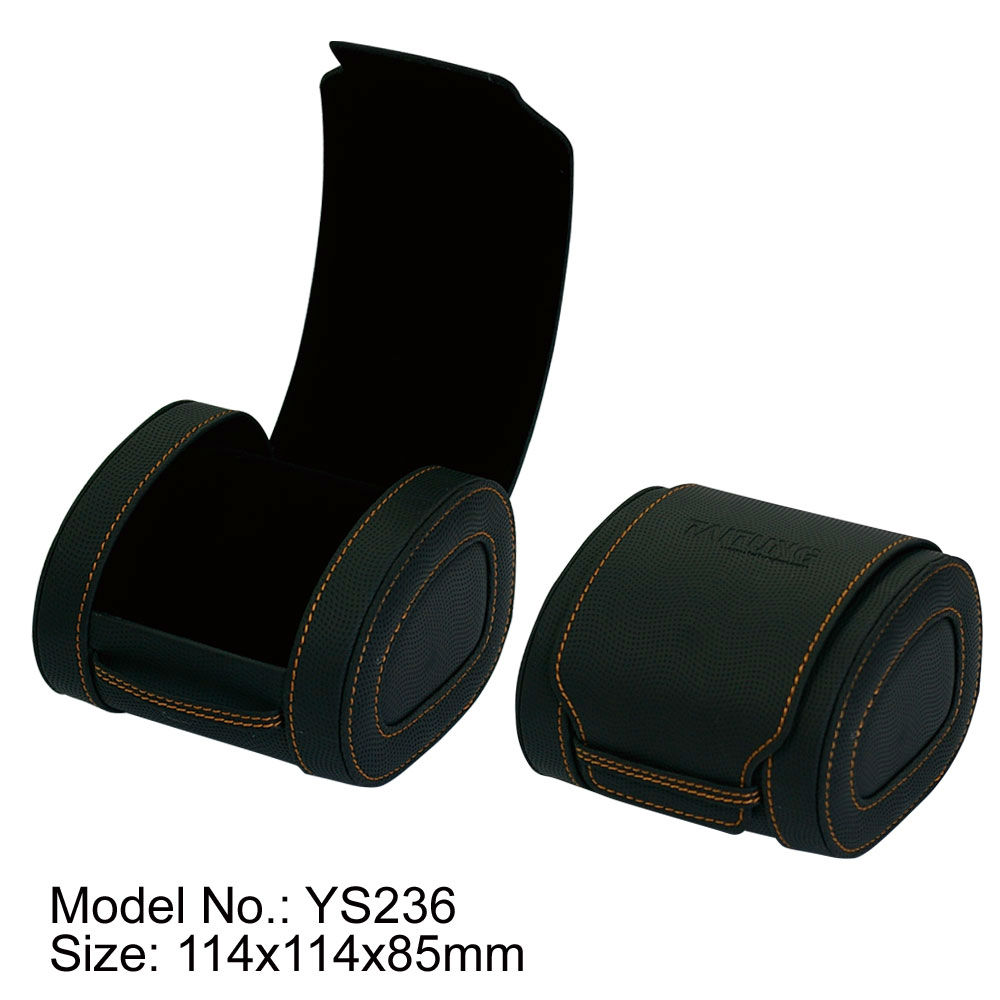 The displayed arcuate watch box comes in a curved design and can store one watch inside. It is embellished with stitching details and has a flap closure decorated with brand name. This watch box can protect the watch well and is great for retailing use.