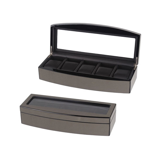 This watch box features five spacious slots. The cushioned interior guarantees maximum protection for your favorite timepiece. Your watch collection can be beautifully displayed through the large viewing window on the top of the watch box.