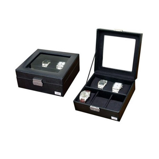 This is a watch display box made of high-quality leather in black. It comes with a window on the cover for added convenience. The soft cushions can protect your watches from scratches.