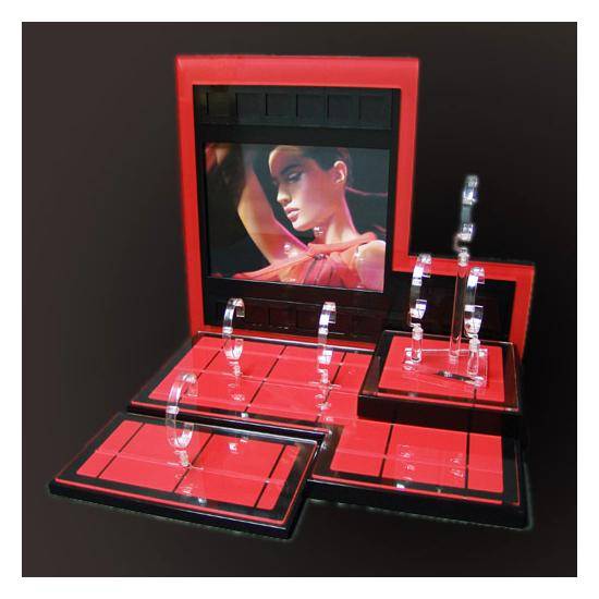 This stylish watch display unit features a backing panel and three platforms to accommodate six watches. The chessboard-like platform gives out a captivating and contrasting appearance. You can customize the photo in the back for enhancing promotion.