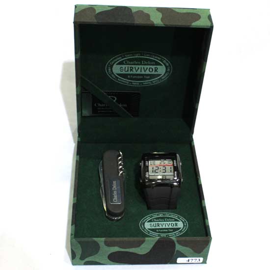 The watch gift set includes a digital watch and a multifunctional knife in a compact design. The items are packaged in a gift box with camouflage patterns. This watch gift makes a great gift idea for people who like camping and outdoor activities.