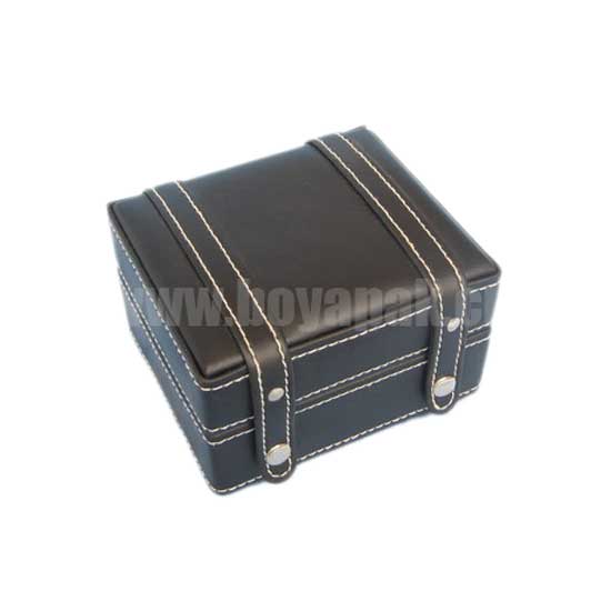 This watch packaging box features a square shape. The exterior is colored in mysterious black, showcasing a smart style. The box is embellished with two straps with snap buttons, offering secure closure. This special watch box adds sincerity to your gift watch.