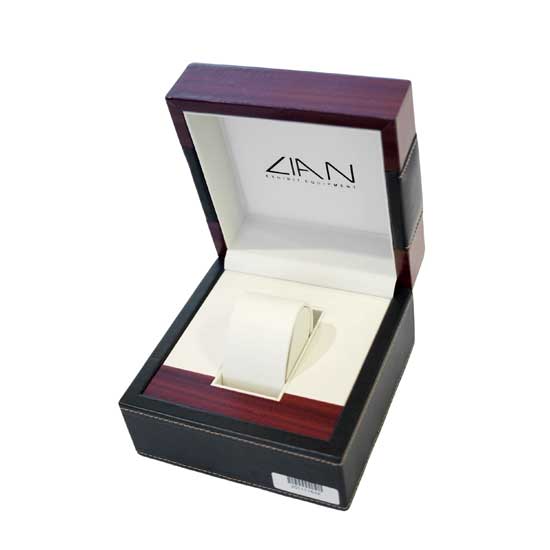 This watch box features a highly durable structure. It is designed in a quadrilateral shape with natural wooden patterns, and black leather-like cover and embellishment. With a soft cushion inside, this box offers reliable protection for your watch.