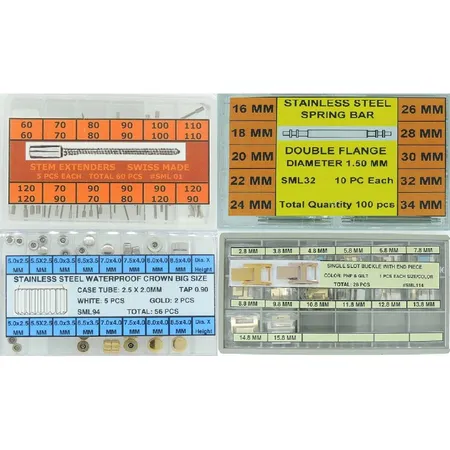 Assortment of Stem, Crowns, Spring bar, Hands, Gaskets, Screws, T-bars, Mineral Glass and Buckles