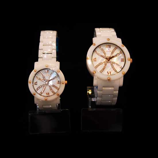 This quartz analog watch set in white is adorned with sparkling stones on the dial. The golden details on the bezel and dial lend a luxurious touch to the look. This sophisticated wristwatch is an ideal choice for ladies.