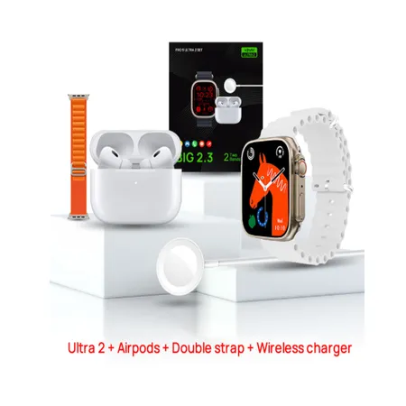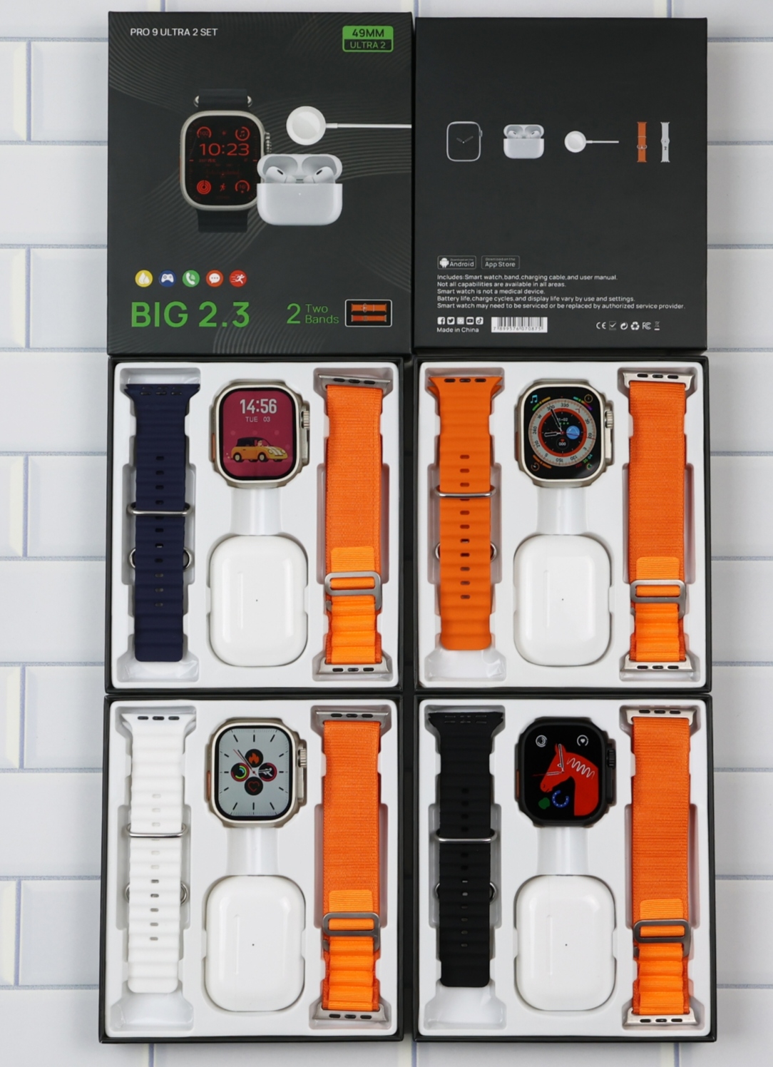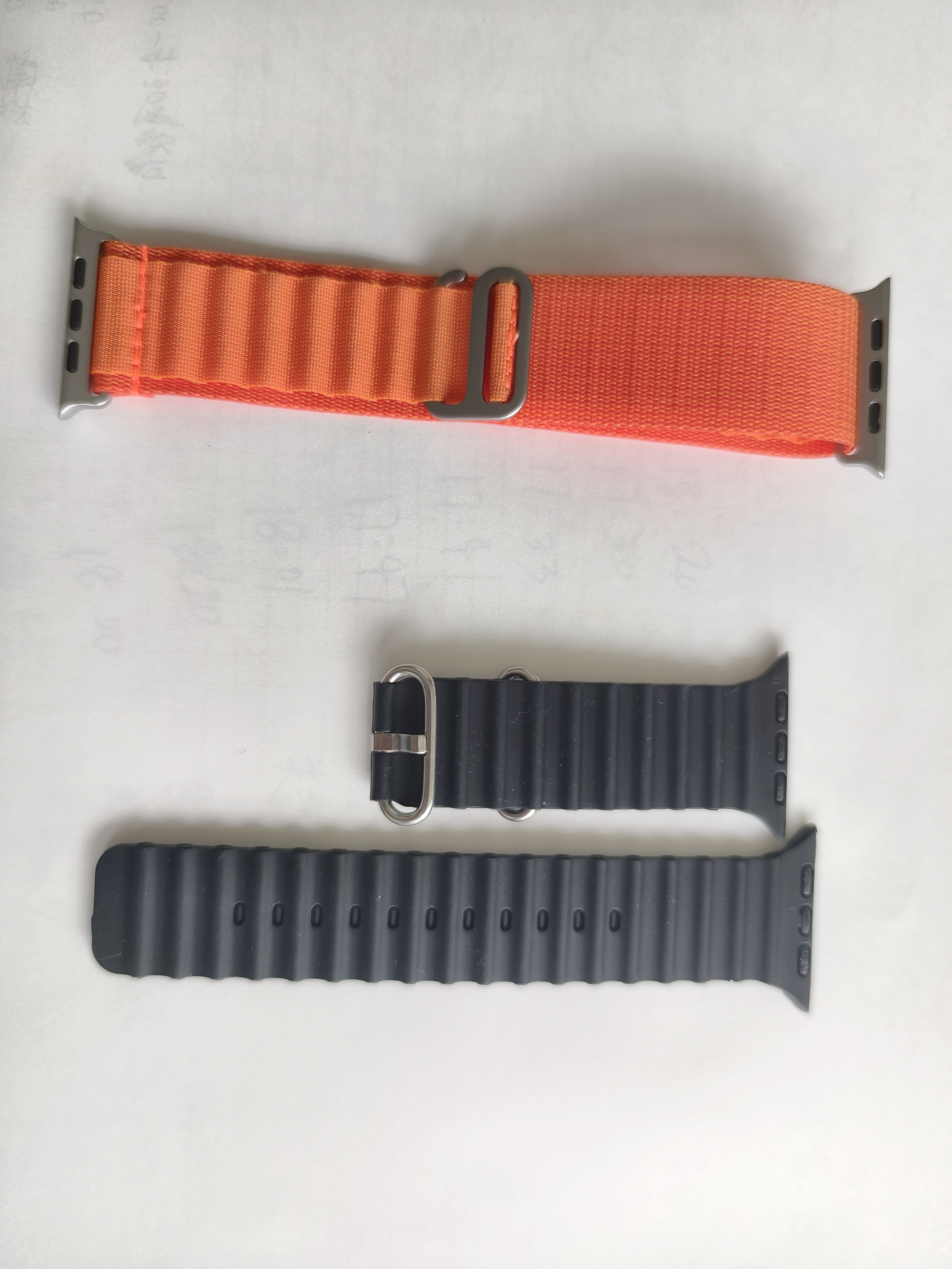 black silicone strap and orange alpine strap + black watch frame + white tws and have film around the tws.