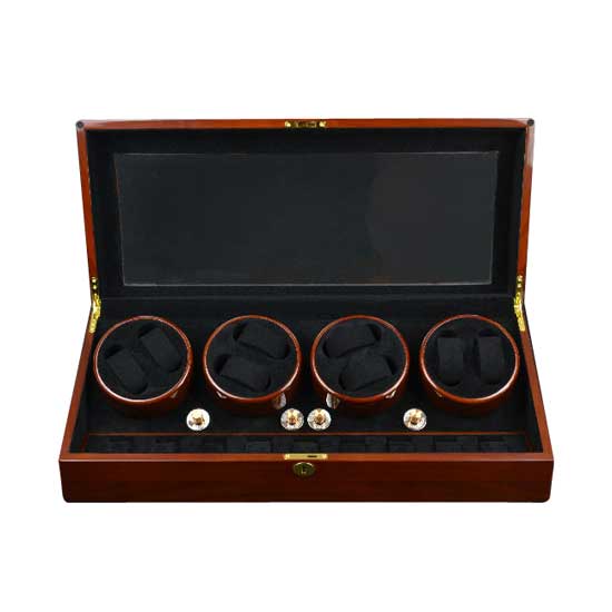 This high-quality watch winder can wind eight watches and store 9 watches. It is made of top-grade walnut wood for a long service life. This well-designed watch winder is a great choice for watch shops.