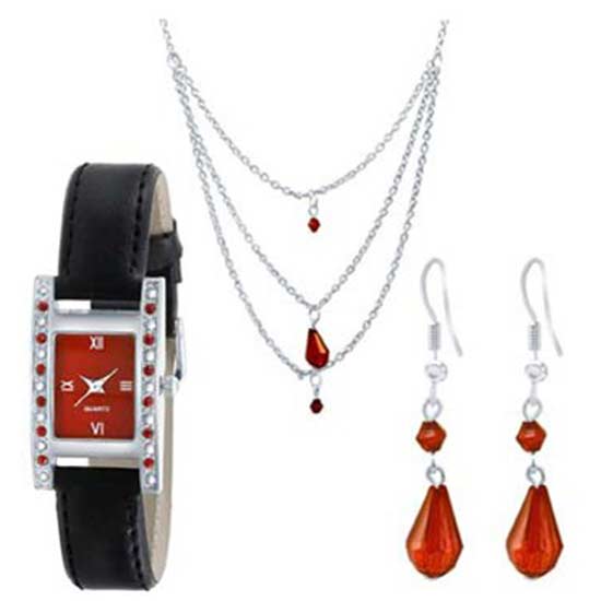 This watch and jewelry set comes with four items including a watch, a necklace and a pair of earrings. The exquisite items feature sparkling red crystals. Enrich your store collection with this gorgeous set.