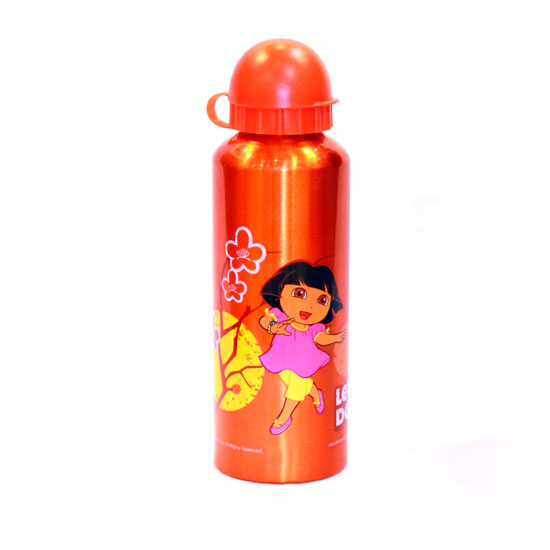 The water bottle showcases an engaging design of Dora the Explorer, a famous American animated TV series. This piece is made out of rugged aluminum for long-term use. Its lid is fitted with a small handle to achieve easy carriage.
