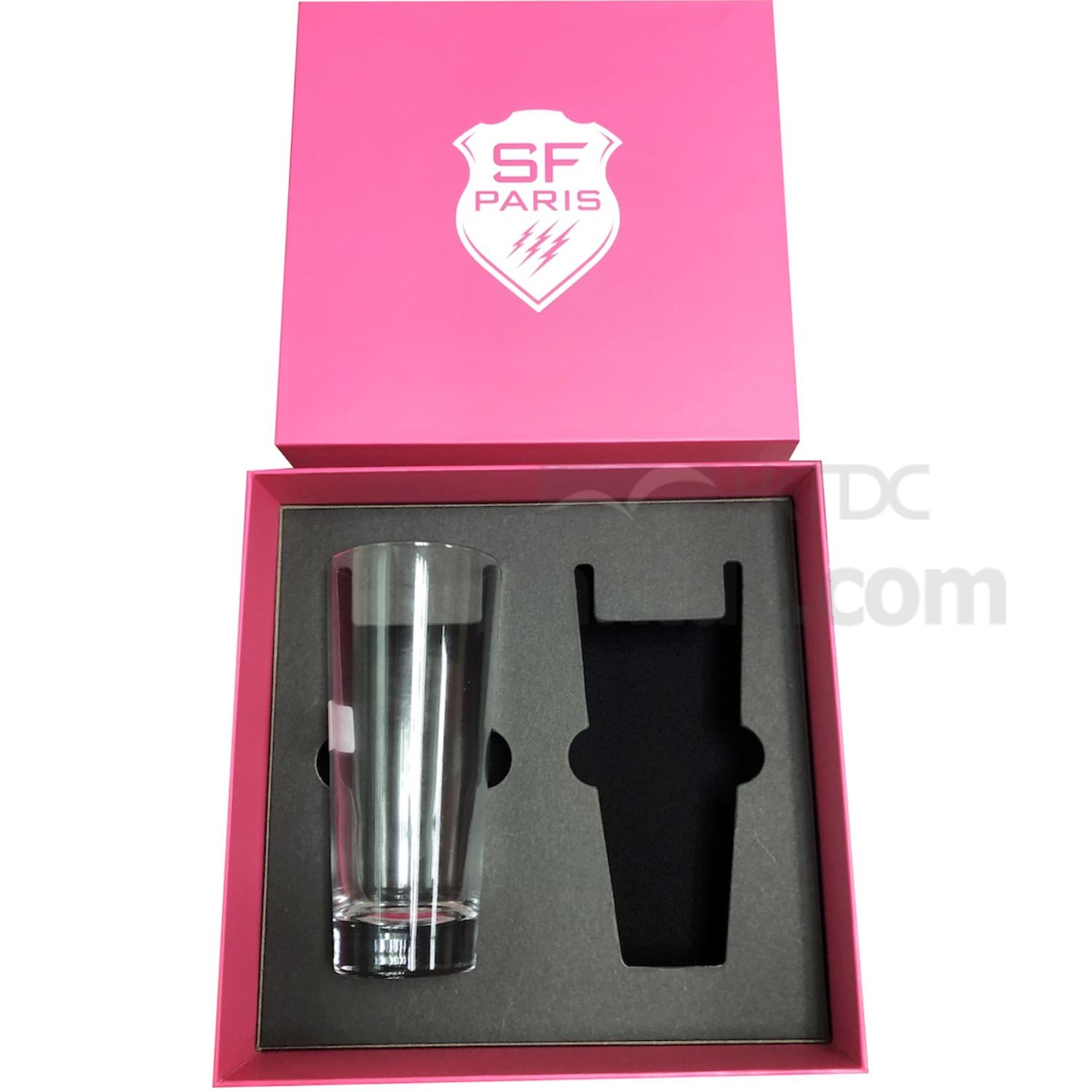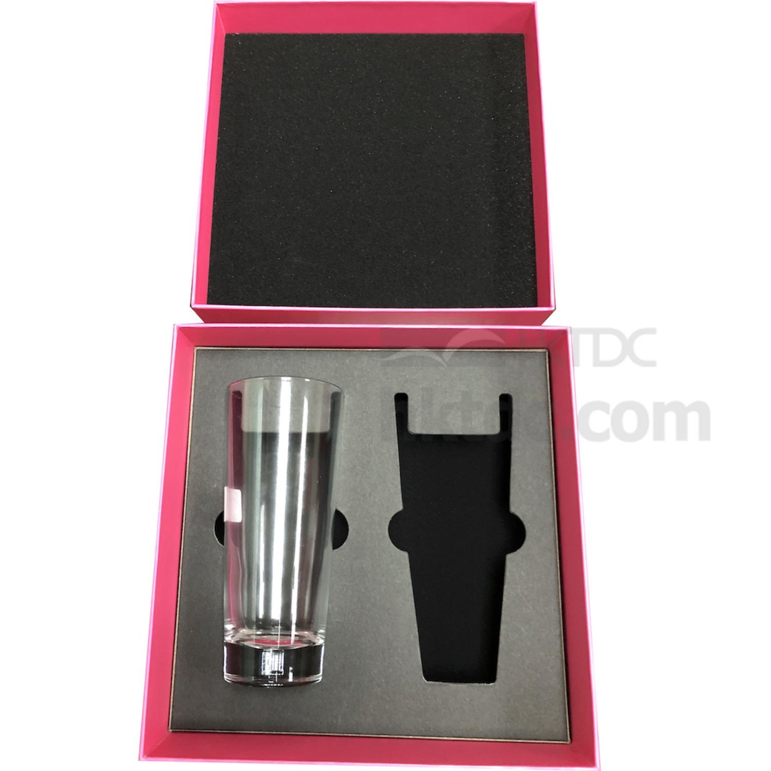 Remarks: this box is designed for water glasses packing. In order to secure glasses, there is making a paper platform with die-cut the shape to fit with pair of glasses, placing 5mm foam at bottom on top respectively of inside outer box to protect glasses in further.