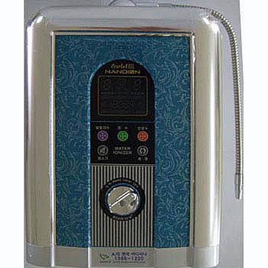 This water ionizer has a contemporary housing with a rectangular screen and a touch panel. It is equipped with up-to-date digital functions to generate alkaline and acid water. It supports automatic voice instructions.