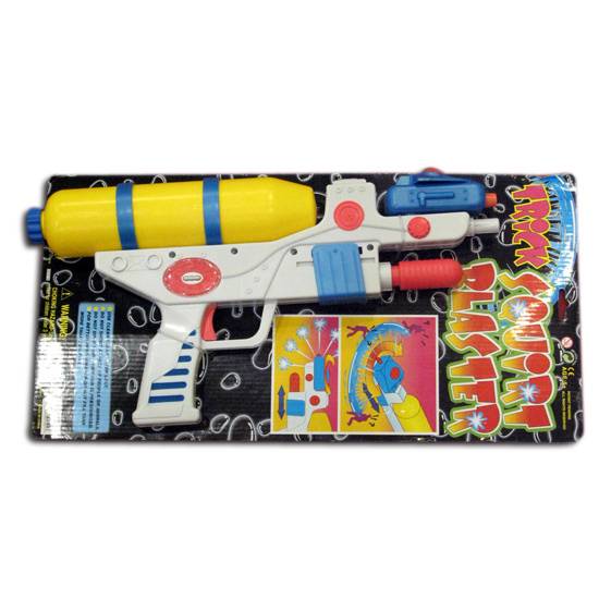 This is a water pistol made of plastic. It can shoot three targets simultaneously. For better performance, it is recommended not to fill the tank more than 75% full.